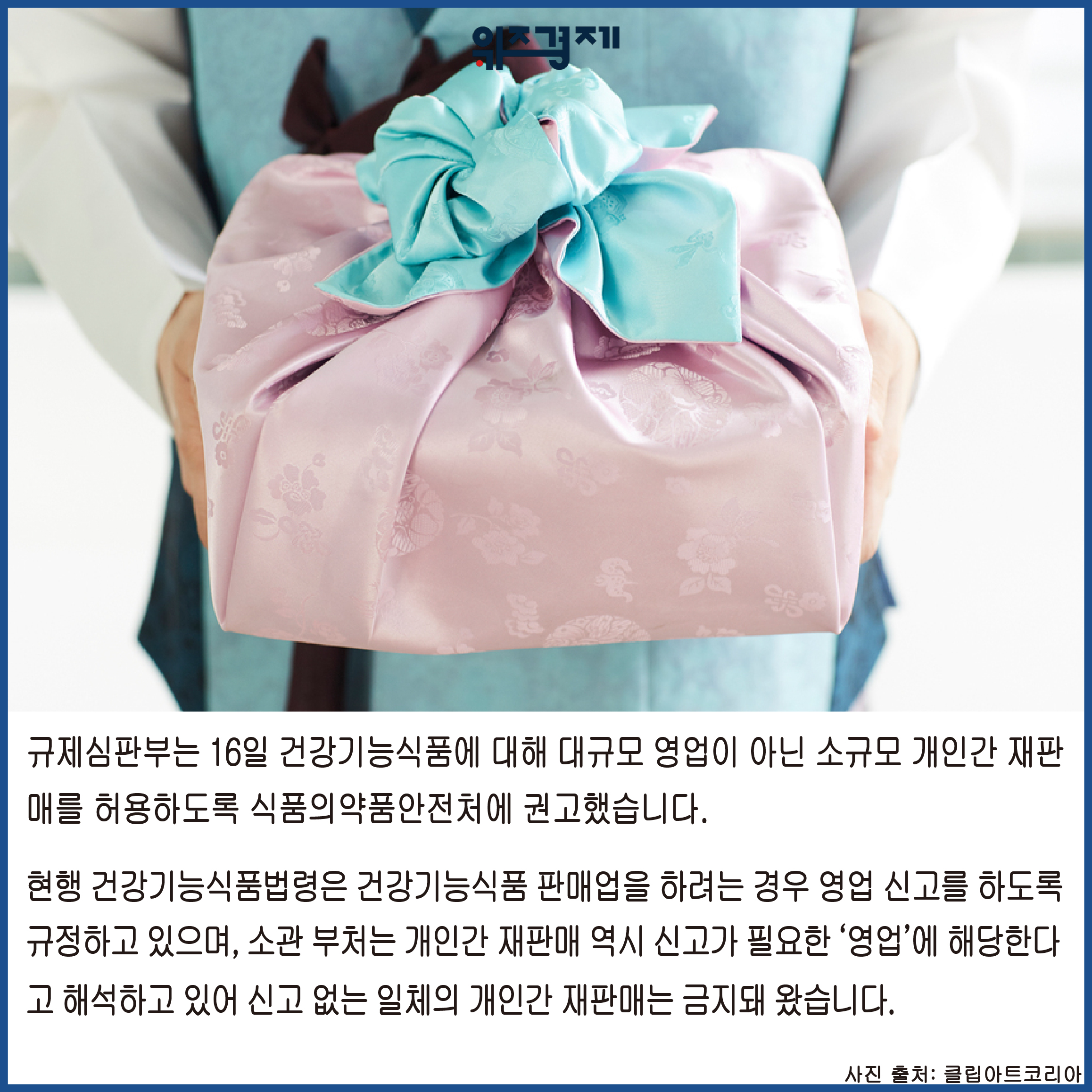 [위즈경제] 이정원 기자 =규제심판부는 16일 건강기능식품에 대해 대규모 영업이 아닌 소규모 개인간 재판매를 허용하도록 식품의약품안전처에 권고했습니다.