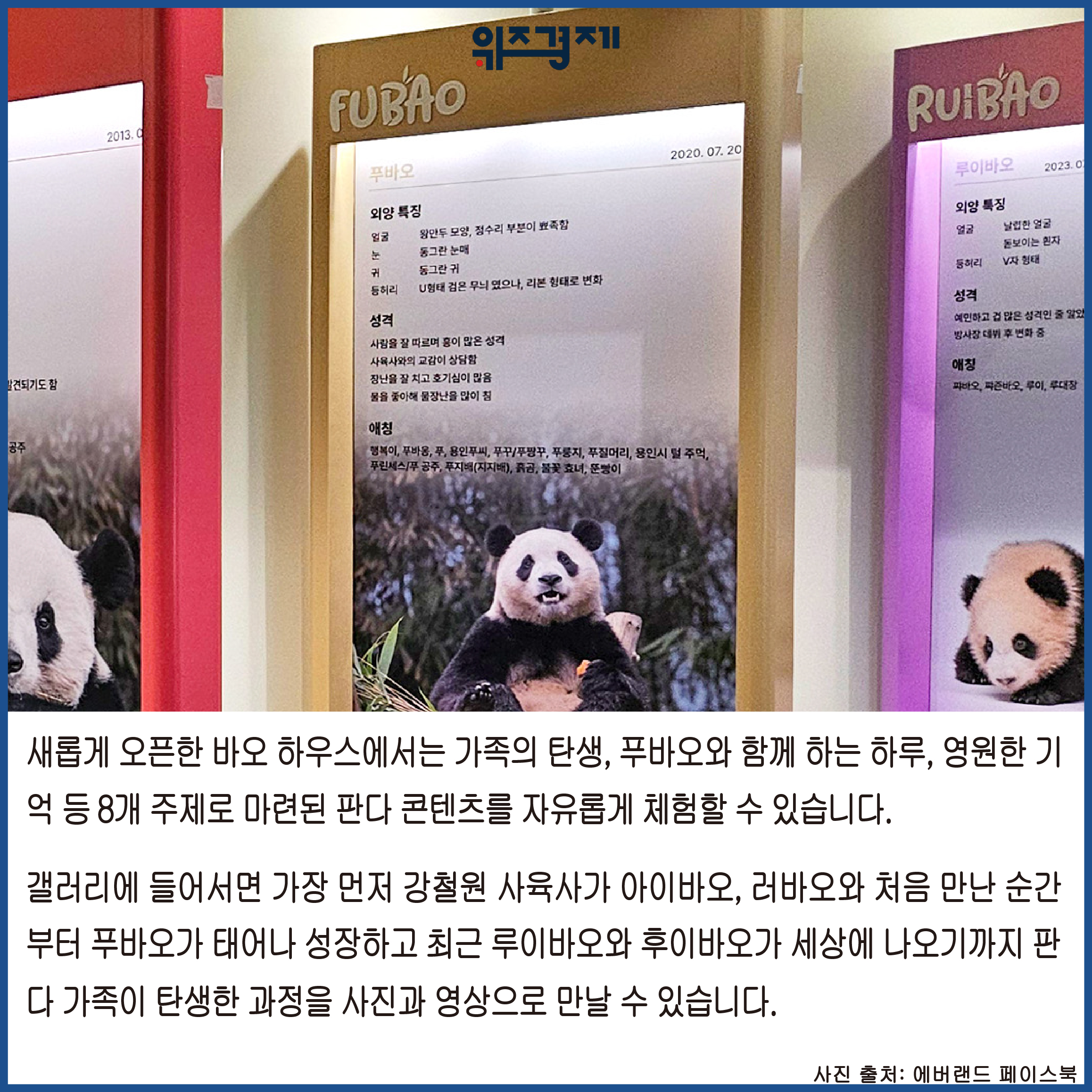 만난 순간부터 푸바오가 태어나 성장하고 최근 루이바오와 후이바오가 세상에 나오기까지 판다 가족이 탄생한 과정을 사진과 영상으로 만날 수 있습니다.