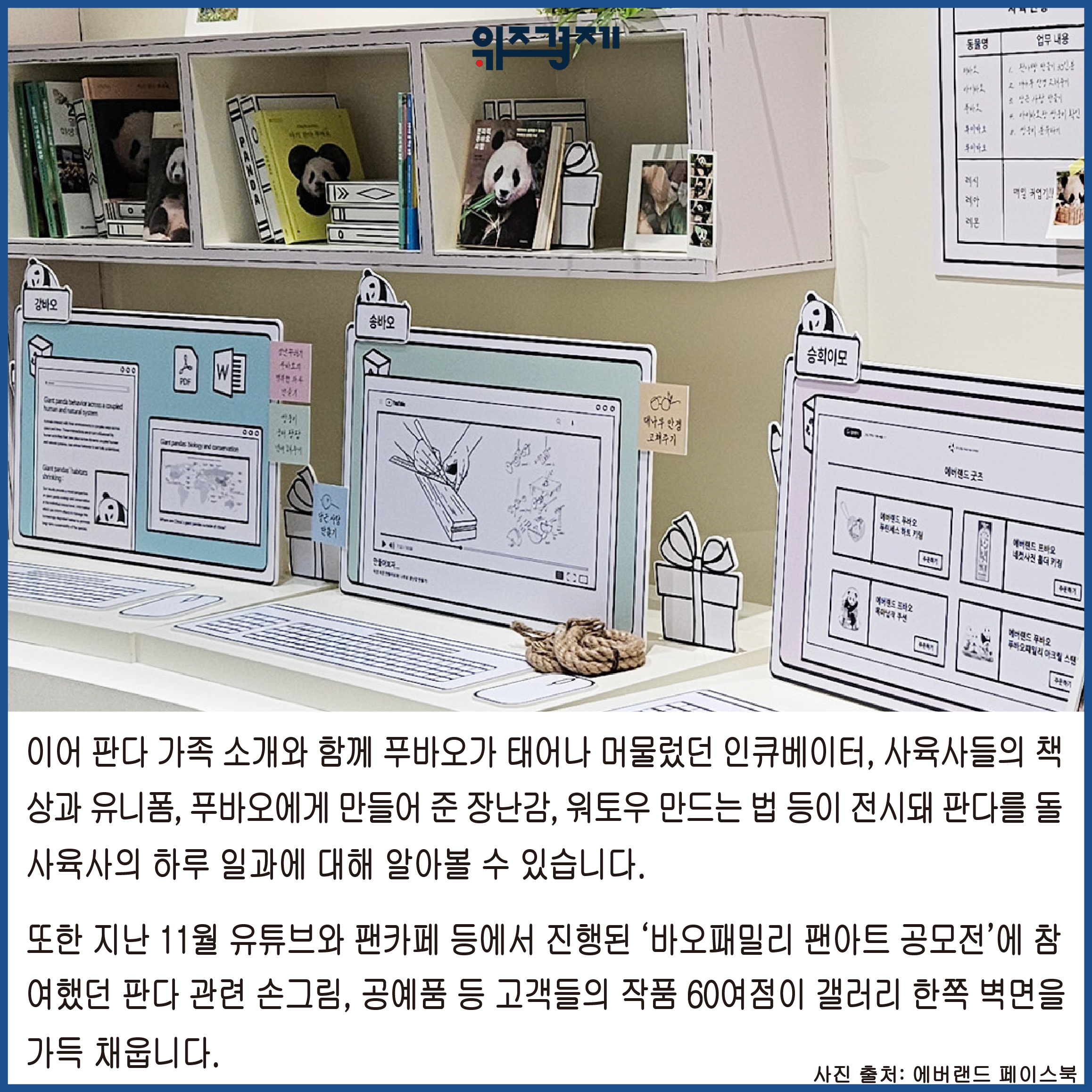 또한 지난 11월 유튜브와 팬카페 등에서 진행된 ‘바오패밀리 팬아트 공모전’에 참여했던 판다 관련 손그림, 공예품 등 고객들의 작품 60여점이 갤러리 한쪽 벽면을 가득 채웁니다.