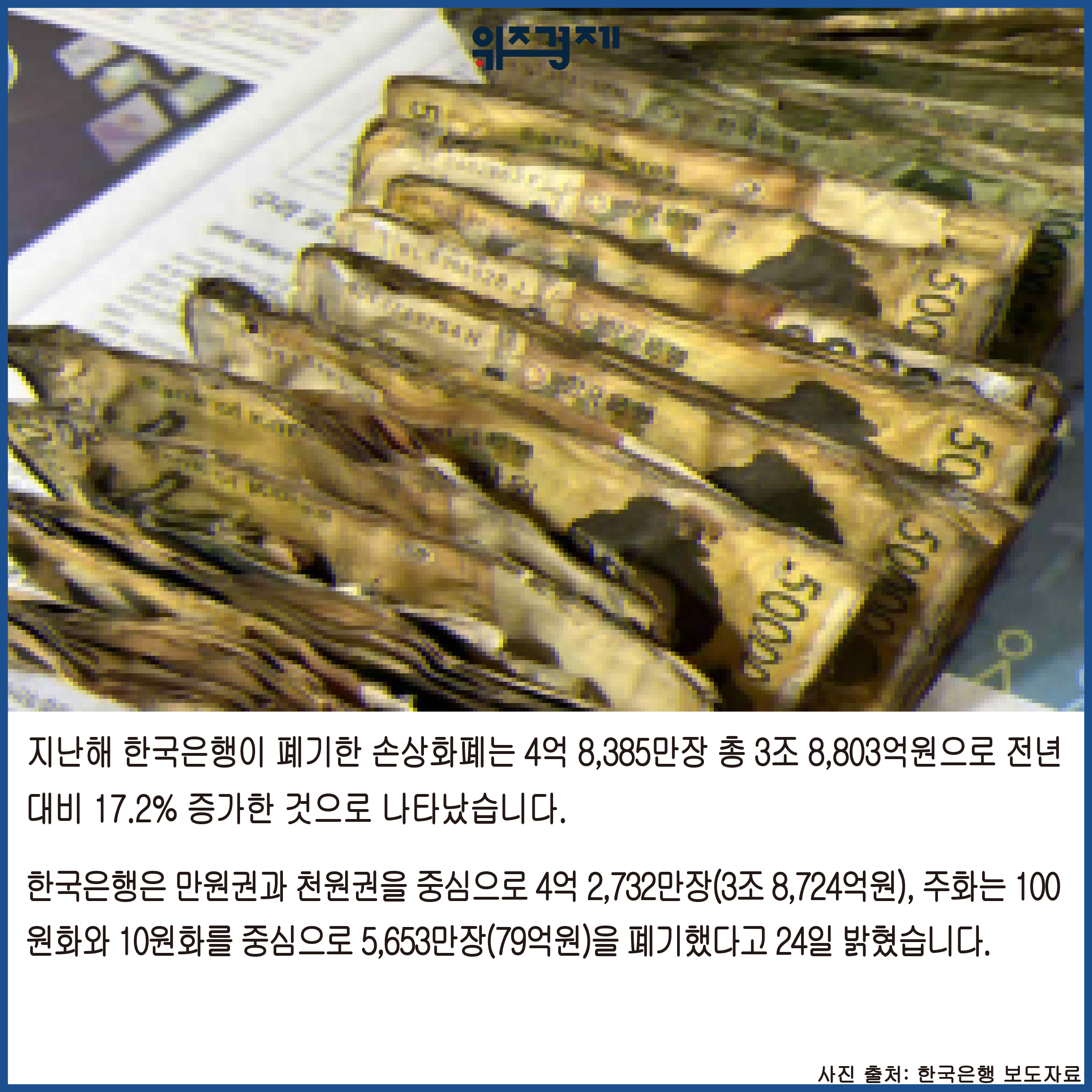 [위즈경제] 이정원 기자 =지난해 한국은행이 폐기한 손상화폐는 4억 8,385만장 총 3조 8,803억원으로 전년 대비 17.2% 증가한 것으로 나타났습니다.