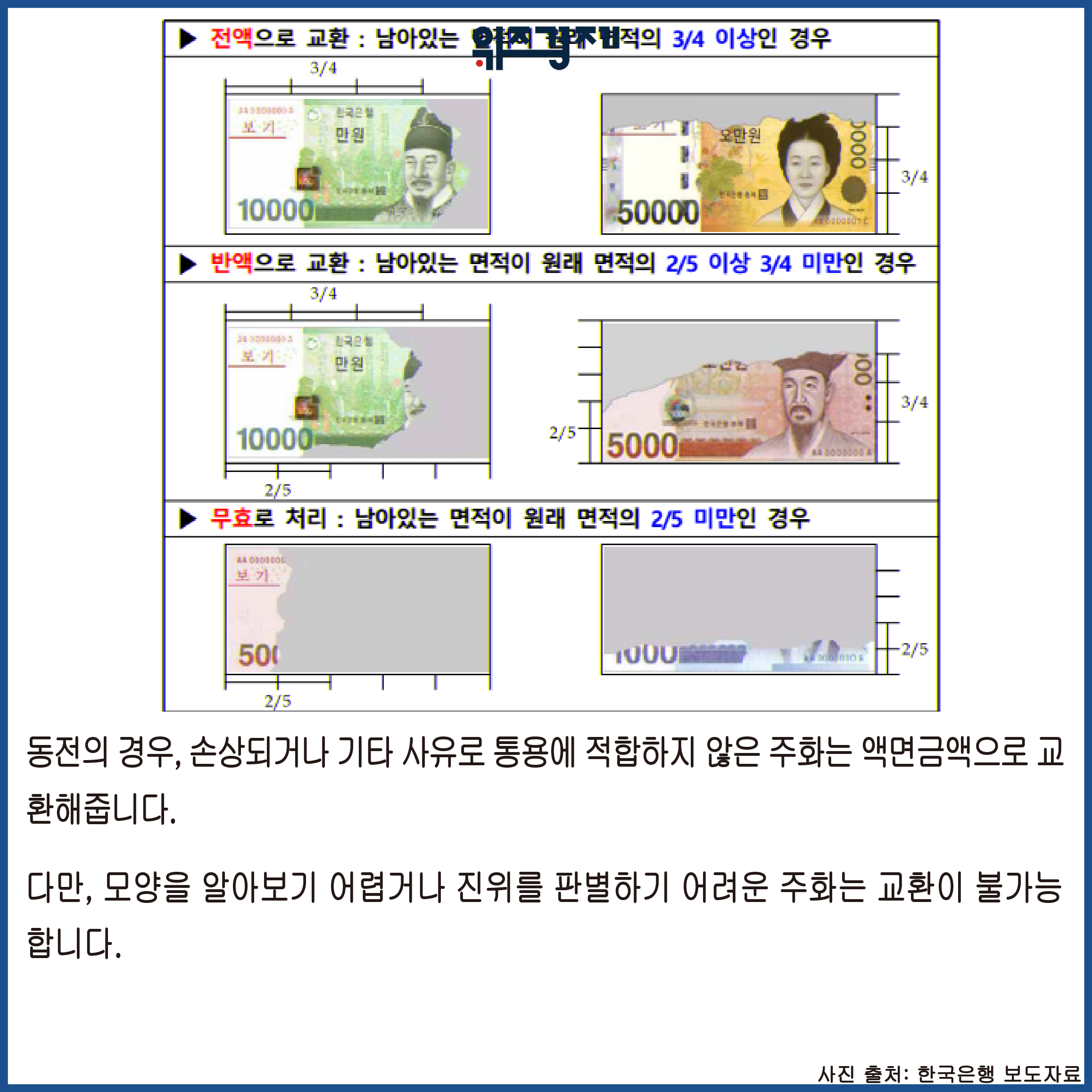 한은은 화재 등으로 은행권이 손상되어 사용할 수 없게 됐을 경우, 남아있는