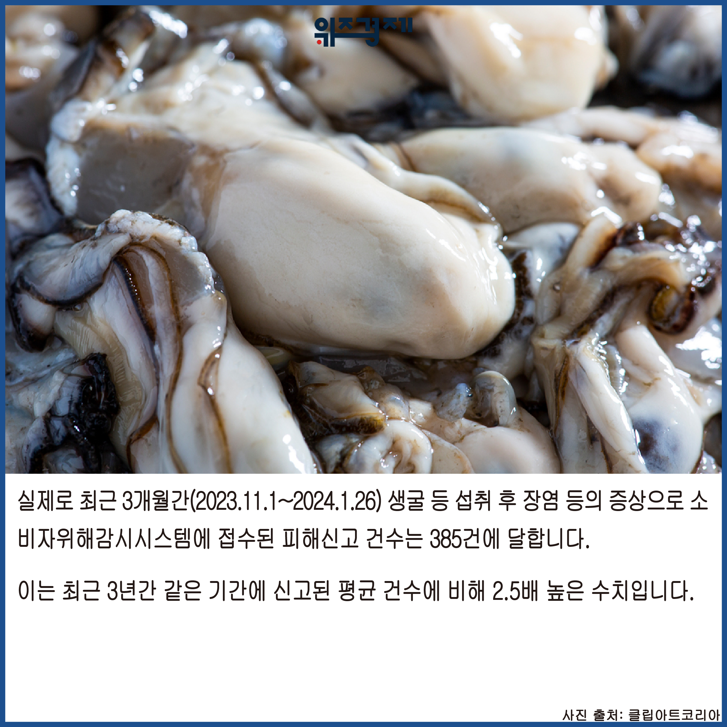 생굴 등 섭취 후 장염 등의 증상으로 소비자위해감시시스템에 접수된 피해신고 건수는 385건에