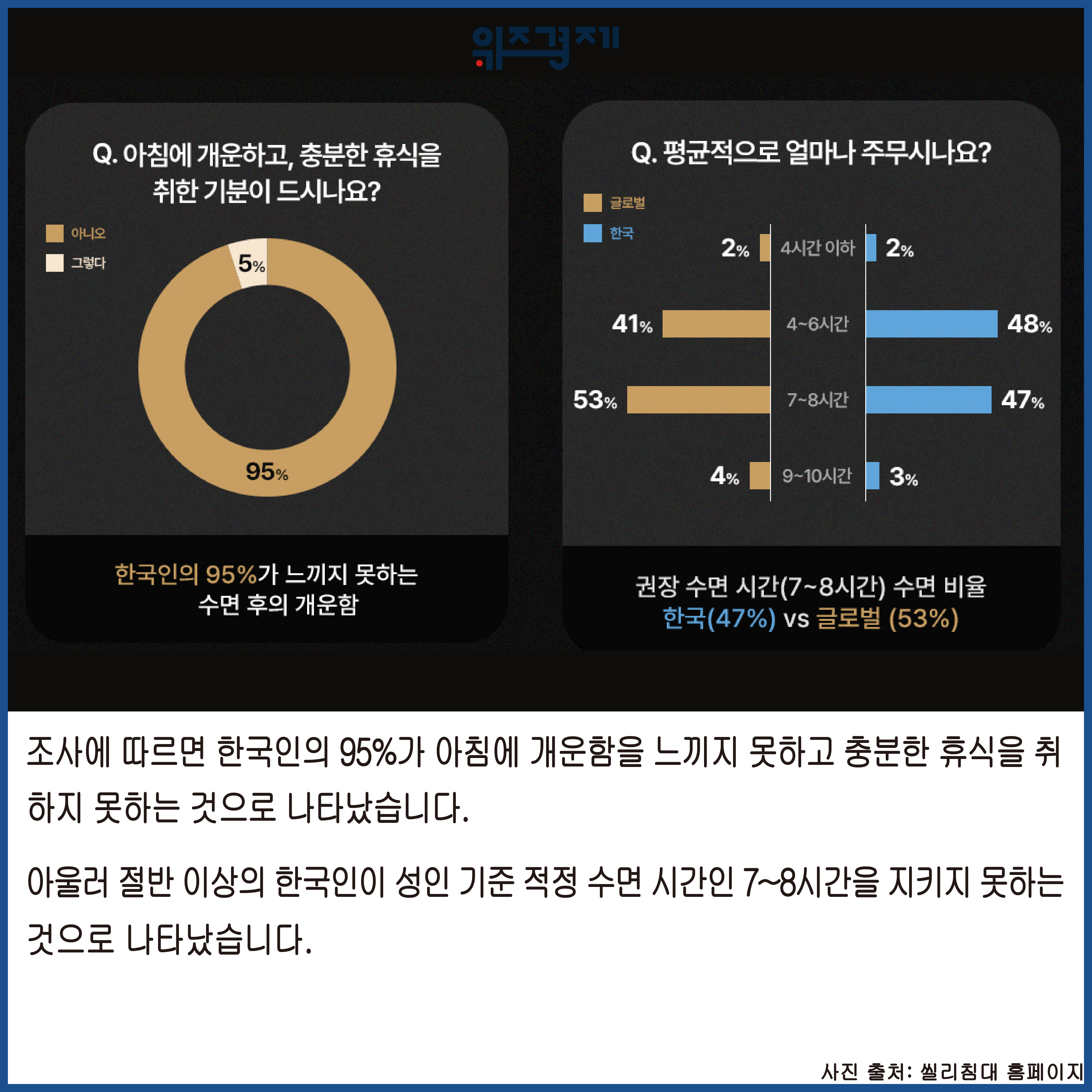 조사에 따르면 한국인의 95%가 아침에 개운함을 느끼지 못하고 충분한 휴식을 취하지 못하는 것으로 나타났습니다.