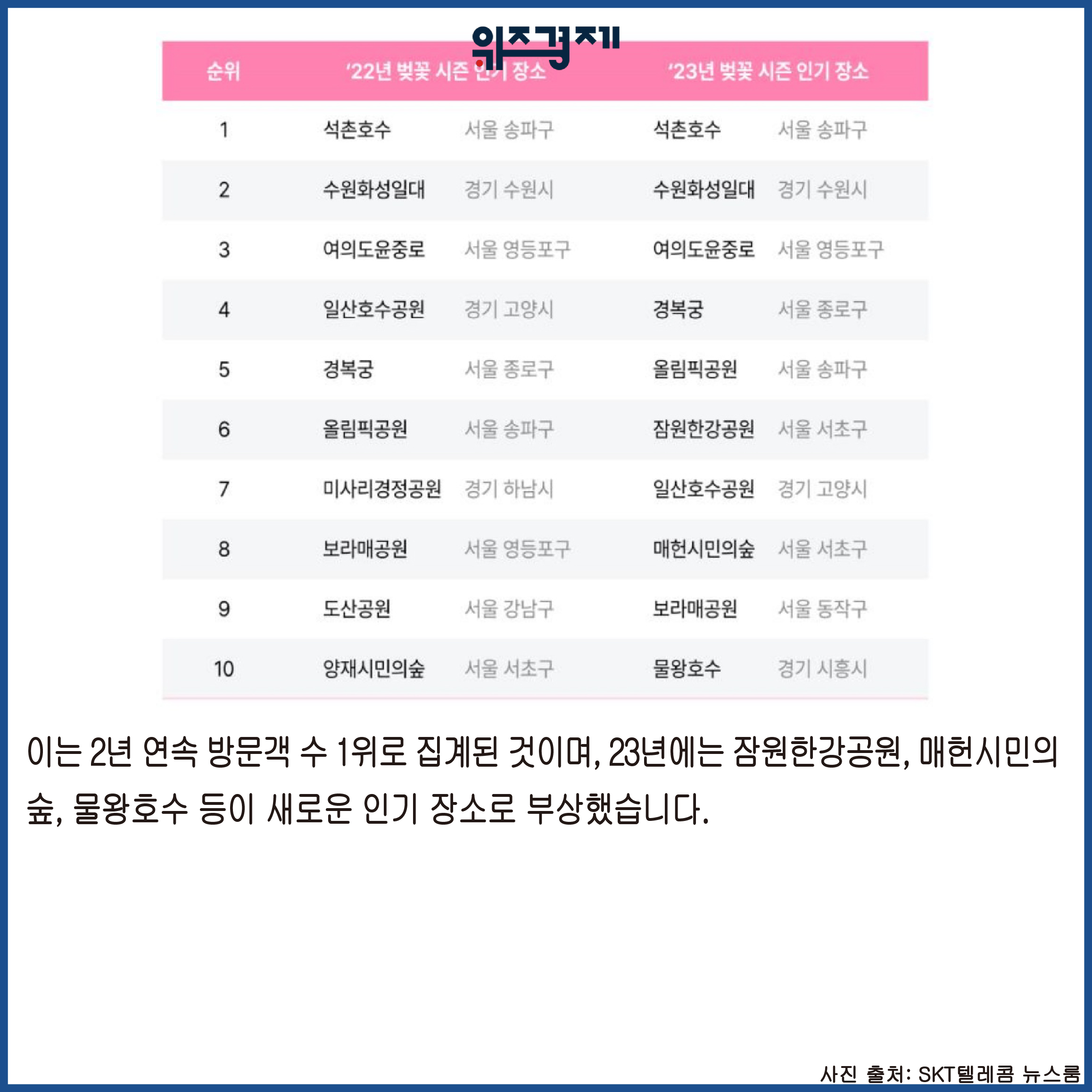 집계된 것이며, 23년에는 잠원한강공원, 매헌시민의숲, 물왕호수 등이 새로운 인기 장소로 부상했습니다.
