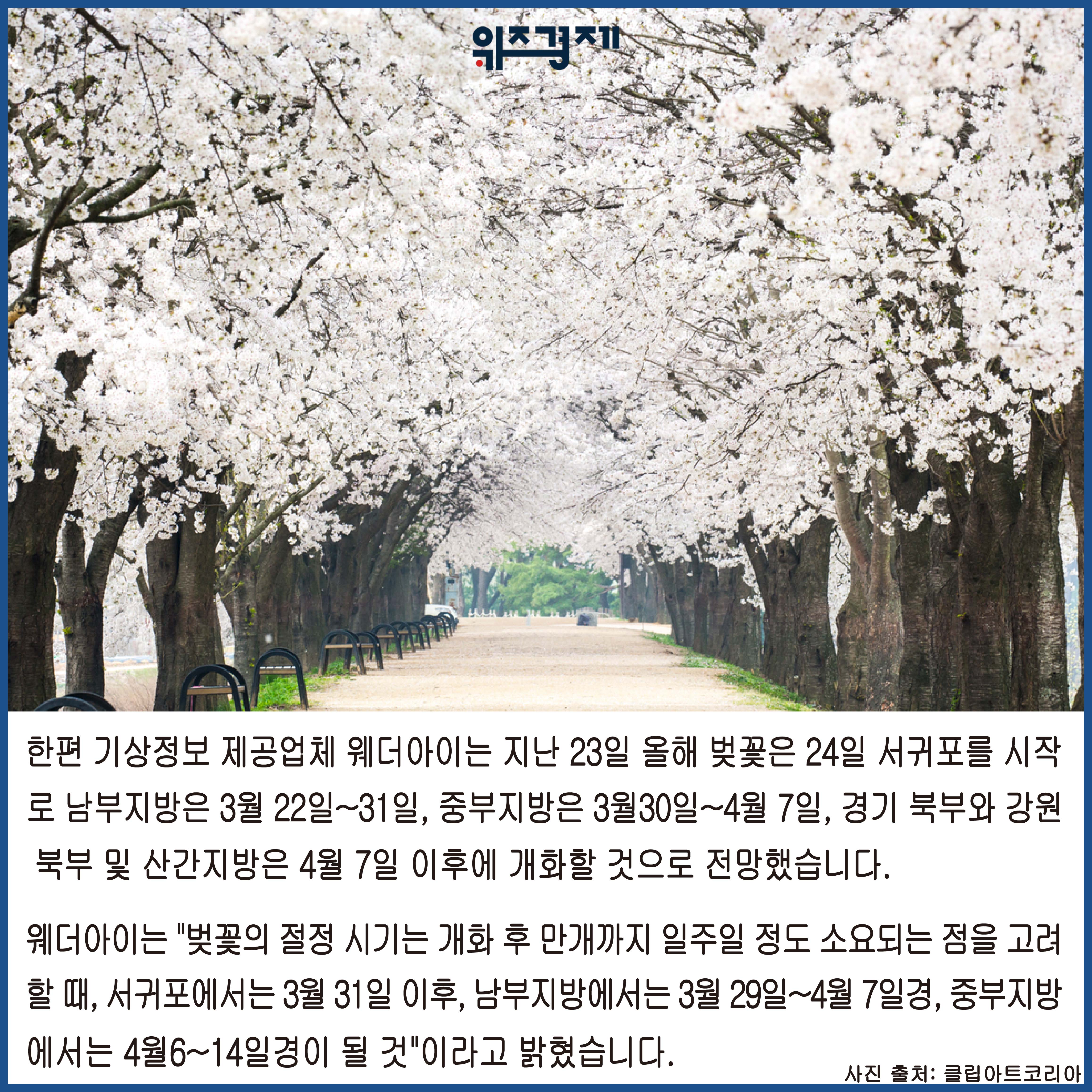 한편 기상정보 제공업체 웨더아이는 지난 23일 올해 벚꽃은 24일 서귀포를 시작으로 남부지방은 3월 22일~31일, 중부지방은 3월30일~4월 7일, 경기 북부와 강원 북부 및 산간지방은 4월 7일 이후에 개화할 것으로 전망했습니다.