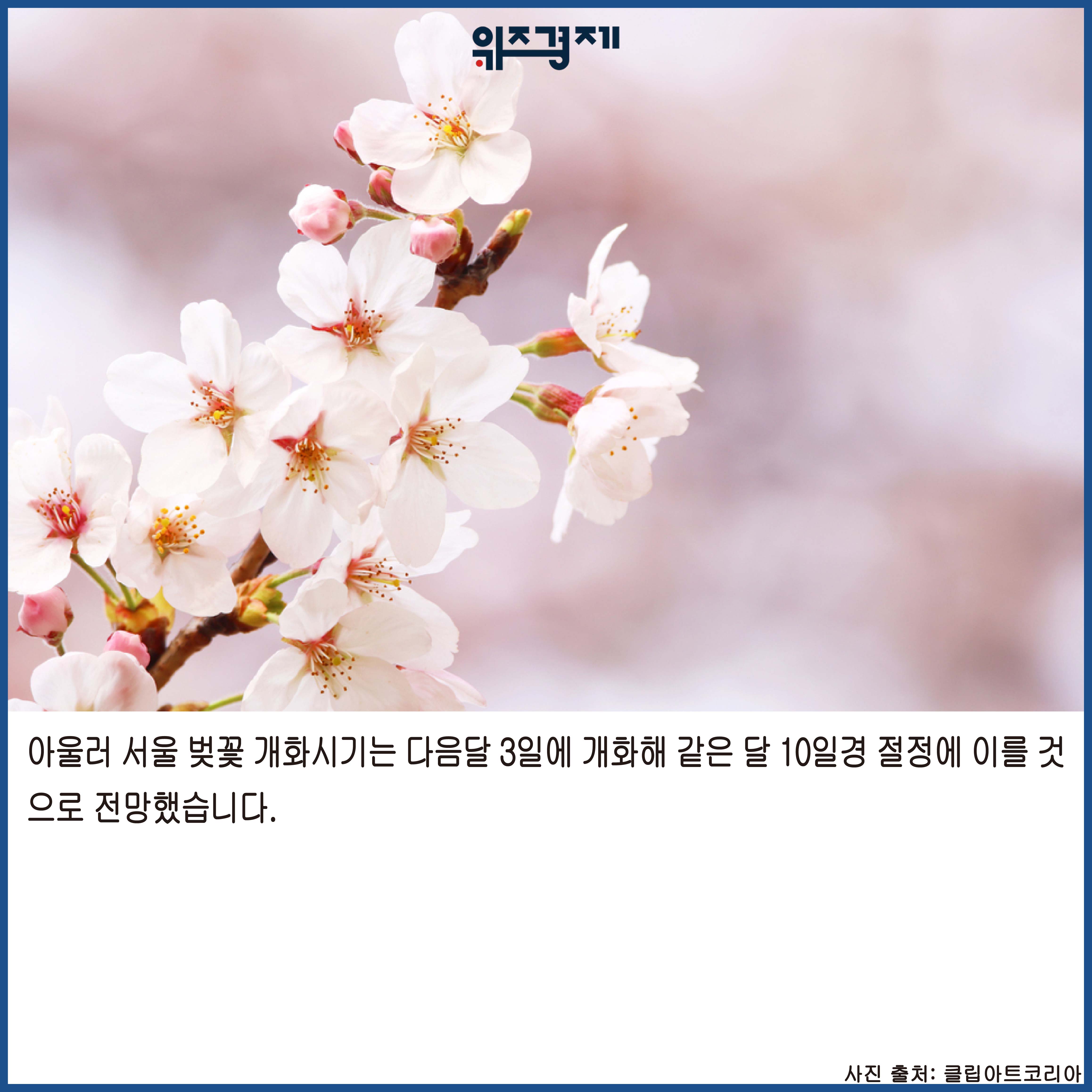 아울러 서울 벚꽃 개화시기를 다음달 3일에 개화해 같은 달 10일경 절정에 이를 것으로 전망했습니다.