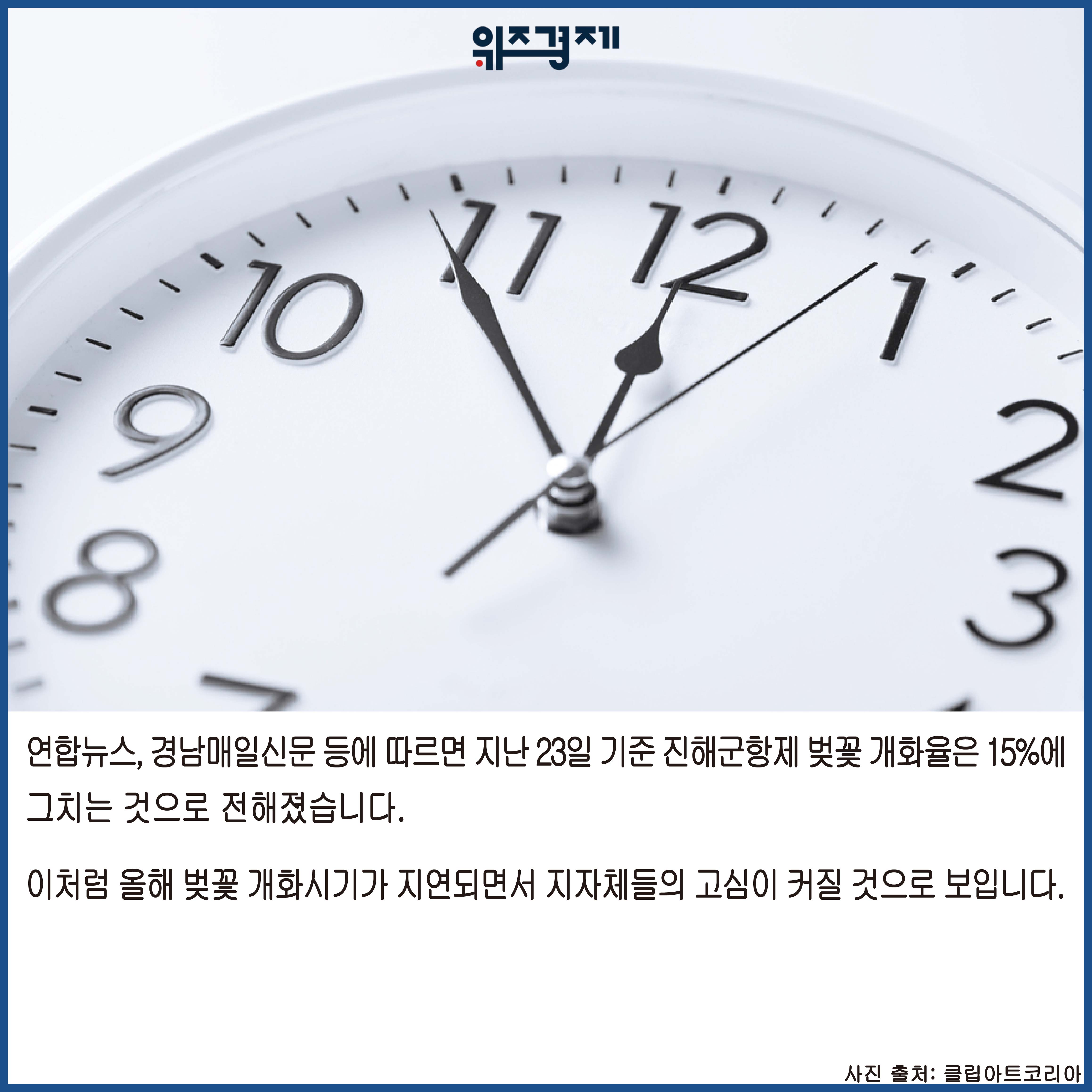 연합뉴스, 경남매일신문 등에 따르면 지난 23일 기준 진해군항제 벚꽃 개화율은 15%에 그치는 것으로 전해졌습니다.