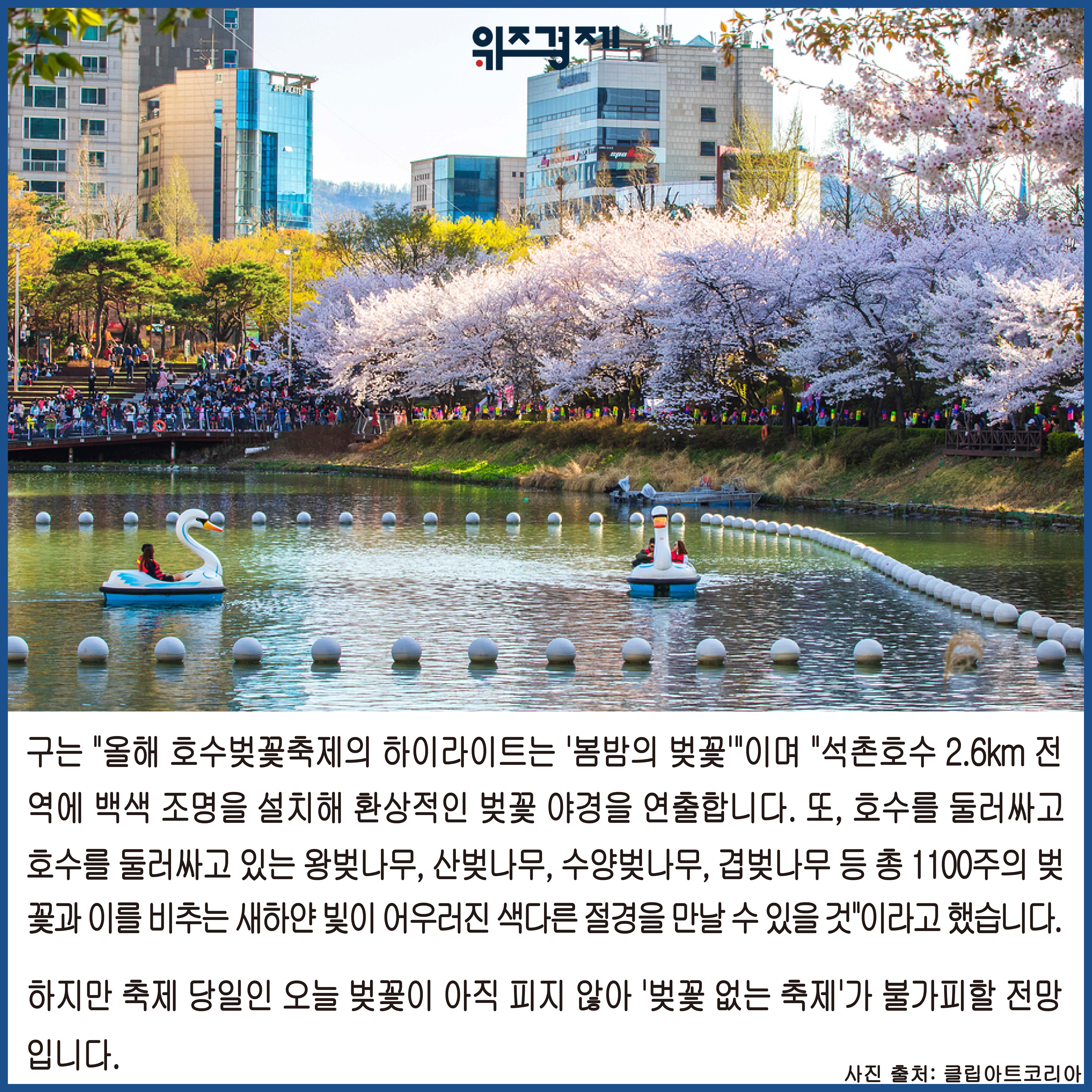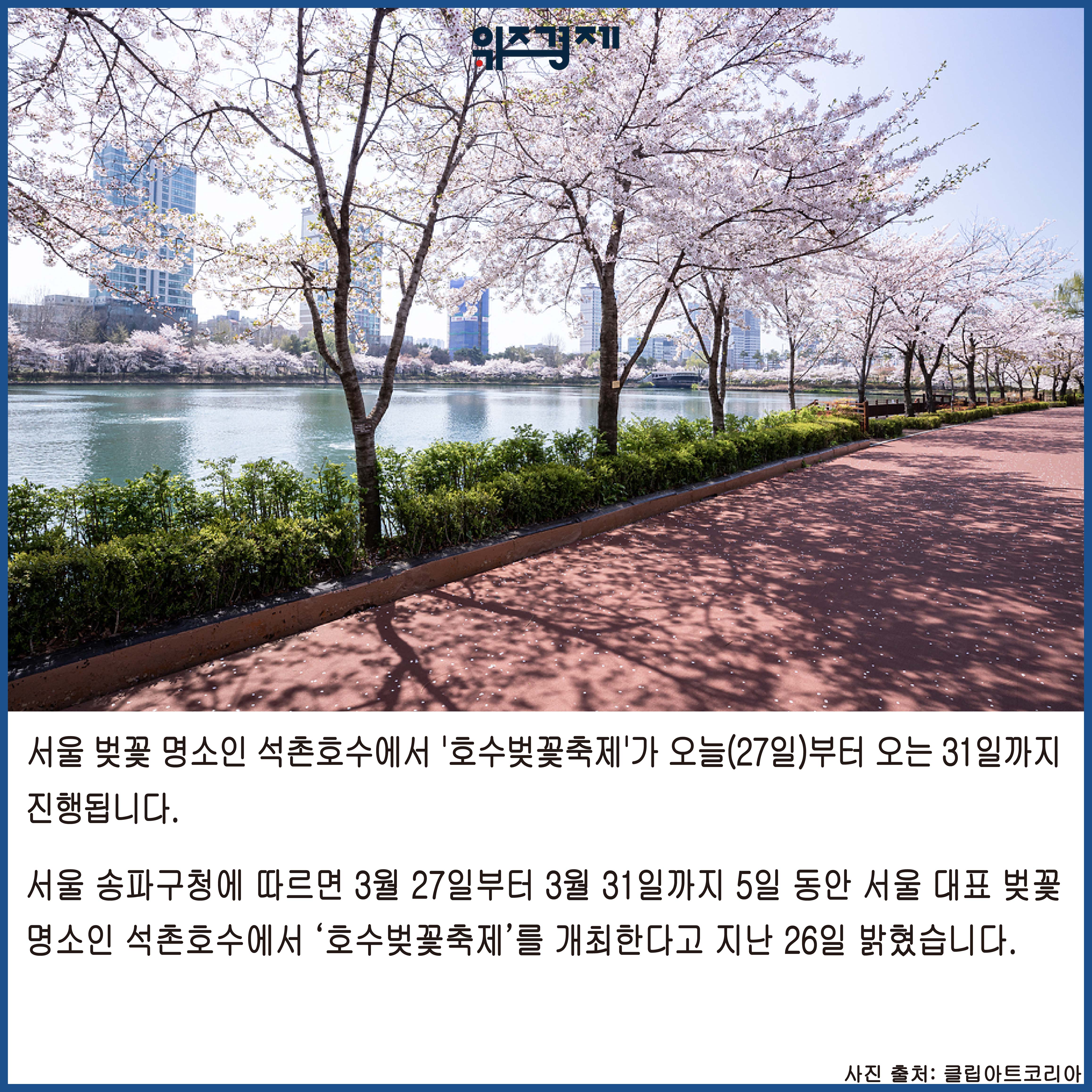 [위즈경제] 이정원 기자 =서울 벚꽃 명소인 석촌호수에서 '호수벚꽃축제'가 오늘(27일)부터 오는 31일까지 진행됩니다.