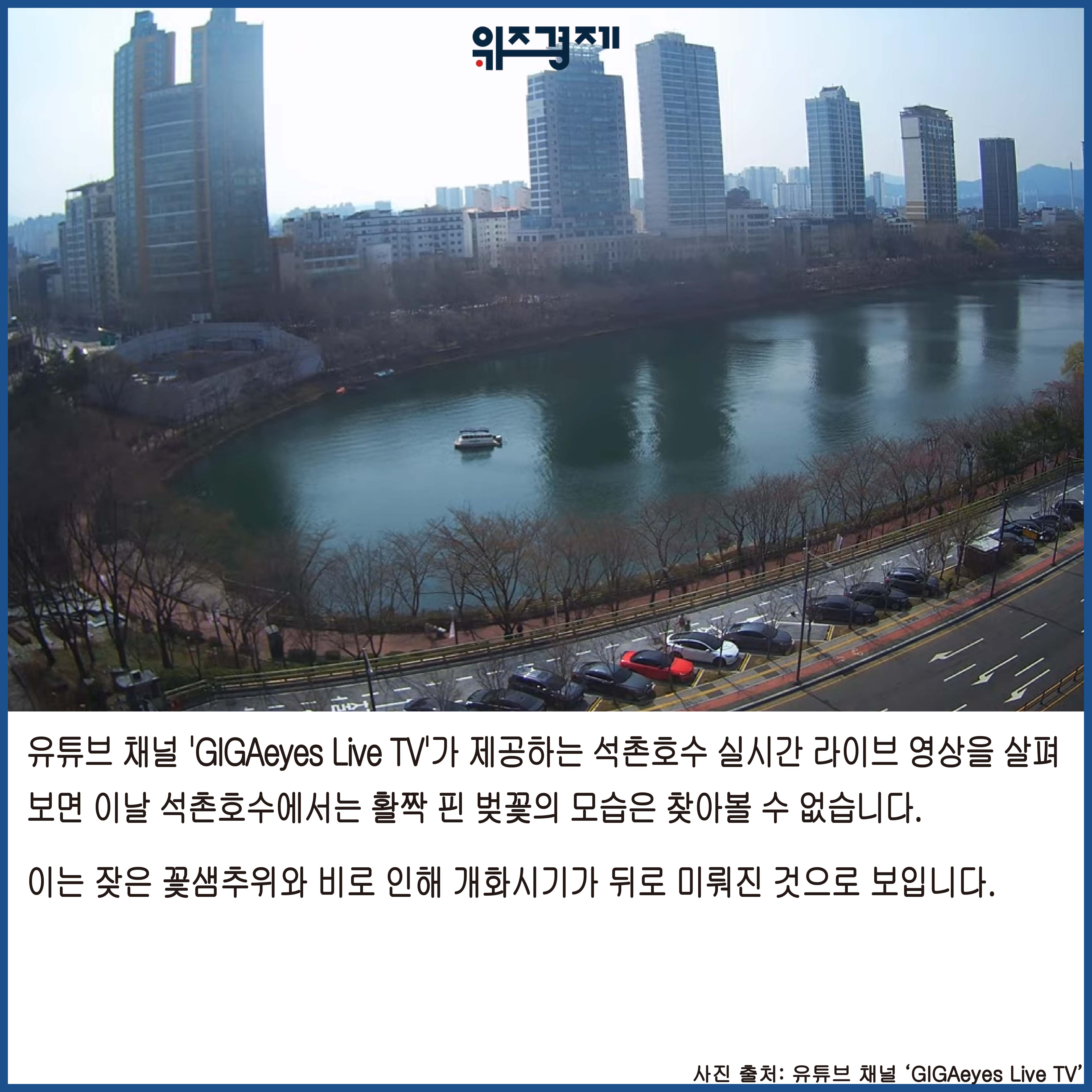 유튜브 채널 'GIGAeyes Live TV'가 제공하는 석촌호수 실시간 라이브 영상을 살펴보면 이날 석촌호수에서는 활짝 핀 벚꽃의 모습은 찾아볼 수 없습니다.