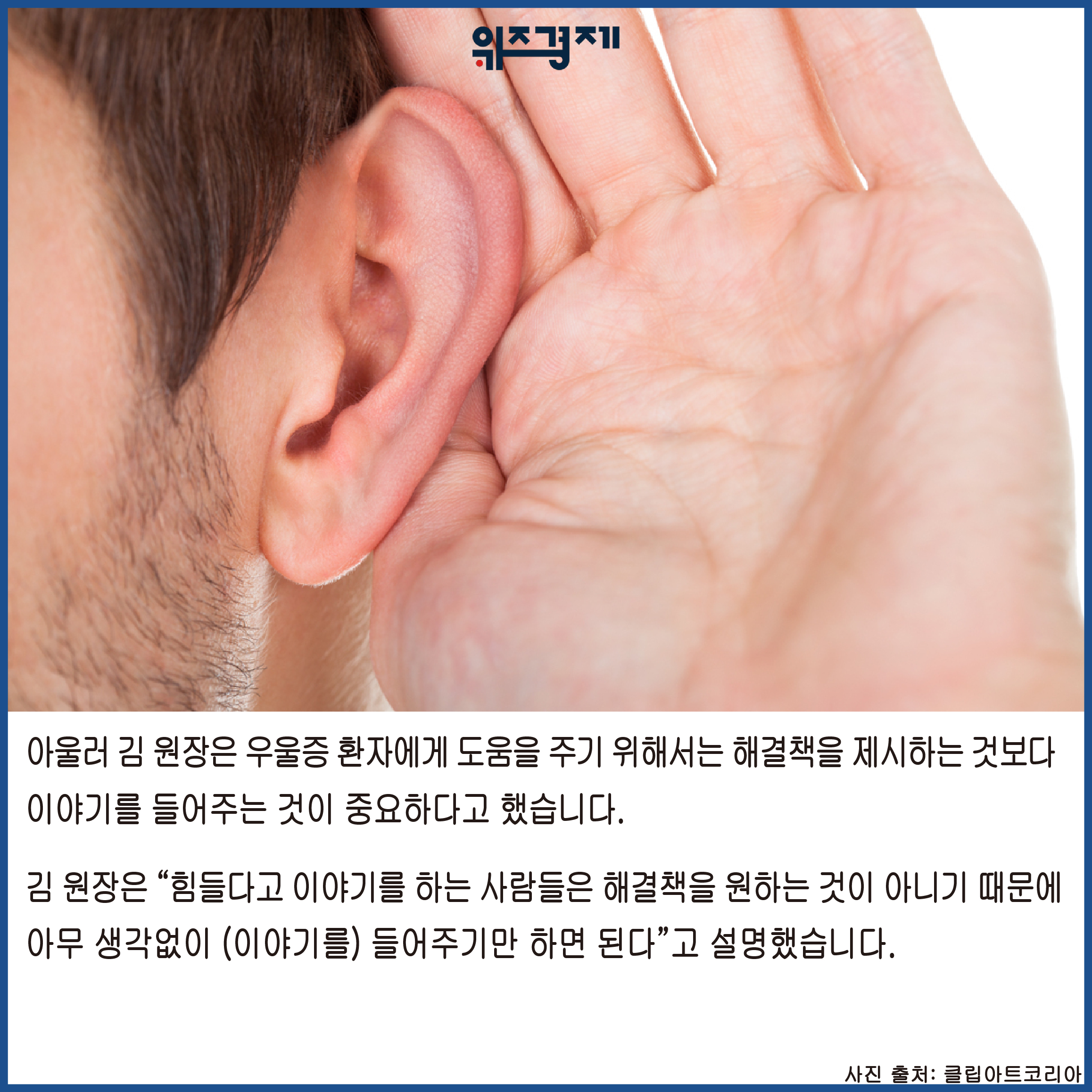 아울러 김 원장은 우울증 환자에게 도움을 주기 위해서는 해결책을 제시하는 것보다 이야기를 들어주는 것이 중요하다고