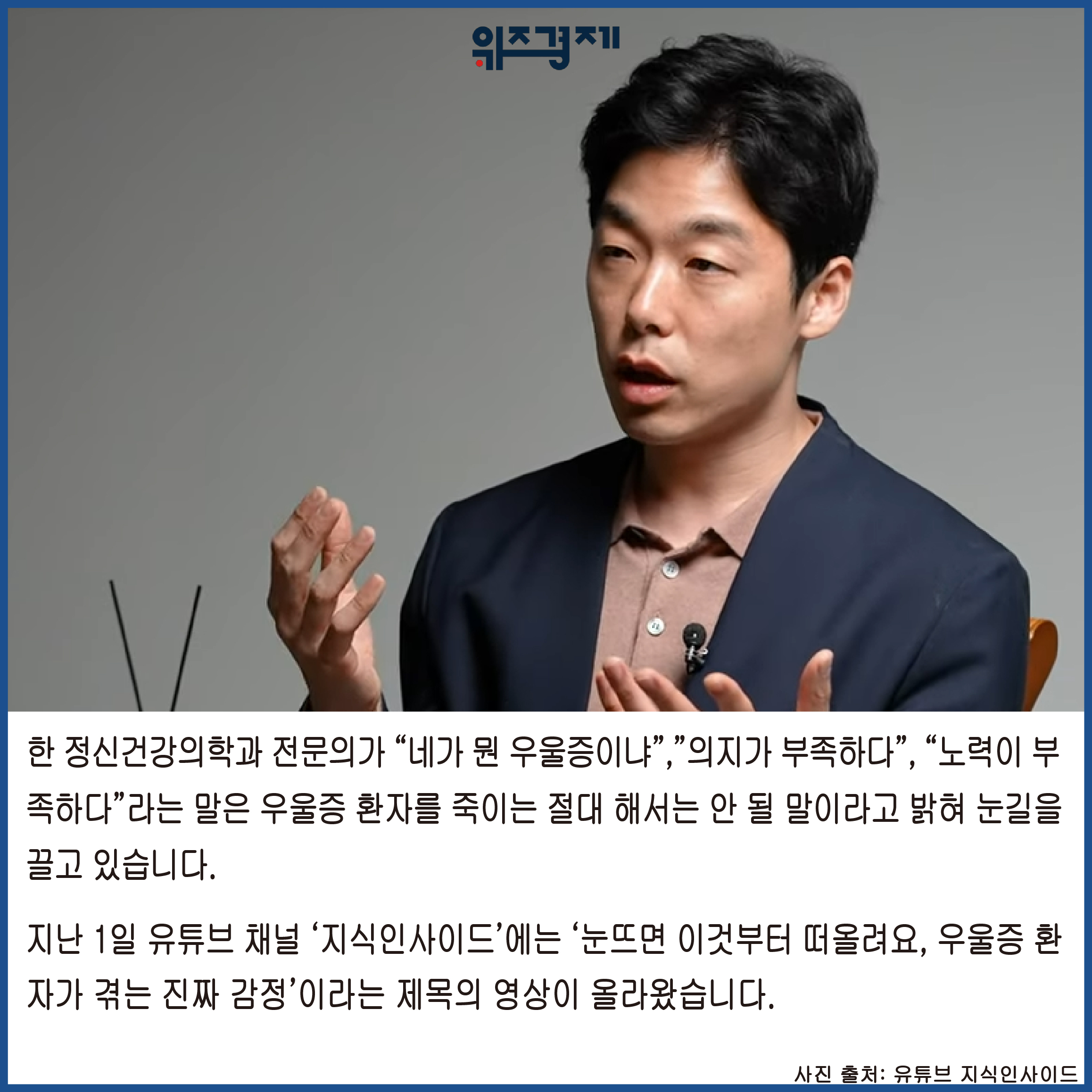 [위즈경제] 이정원 기자 =한 정신건강의학과 전문의가 “네가 뭔 우울증이냐”, ”의지가 부족하다”, “노력이 부족하다”라는 말은 우울증 환자를 죽이는 절대 해서는 안 될 말이라고 밝혀 눈길을 끌고 있습니다.