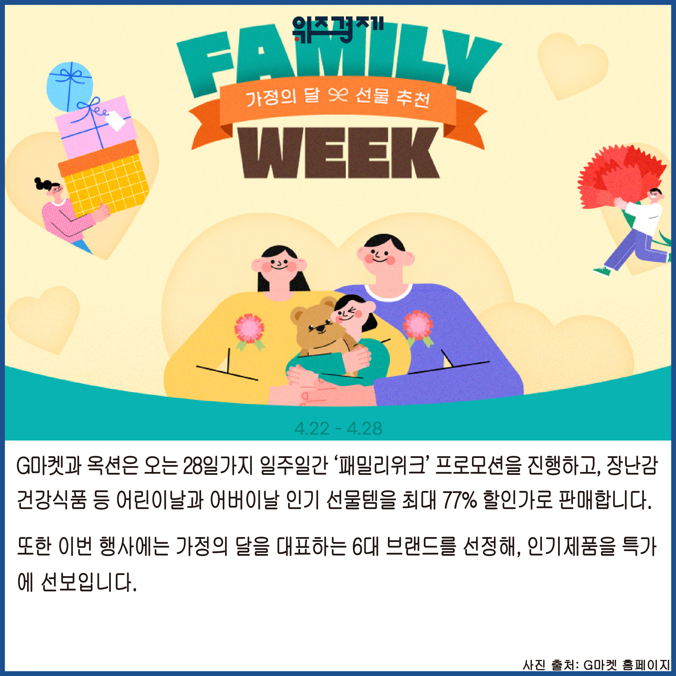 일주일간 ‘패밀리위크’ 프로모션을 진행하고, 장난감, 건강식품 등 어린이날과 어버이날 인기 선물템을 최대 77% 할인가로 판매합니다.