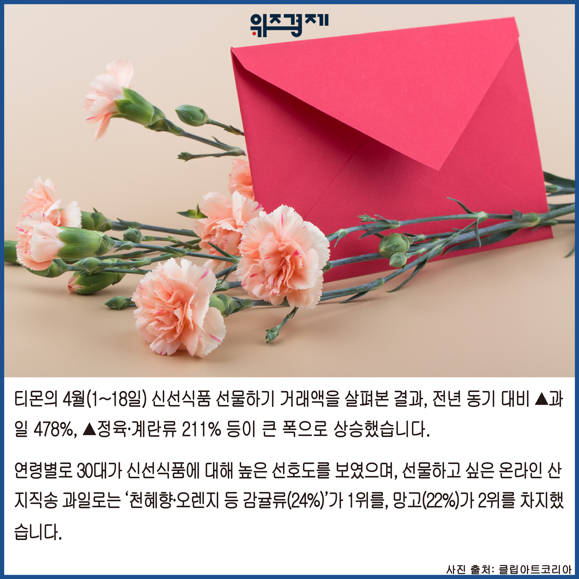 티몬의 4월(1~18일) 신선식품 선물하기 거래액을 살펴본 결과, 전년 동기 대비 ▲과일 478%, ▲정육∙계란류 211% 등이 큰 폭으로 상승했습니다.