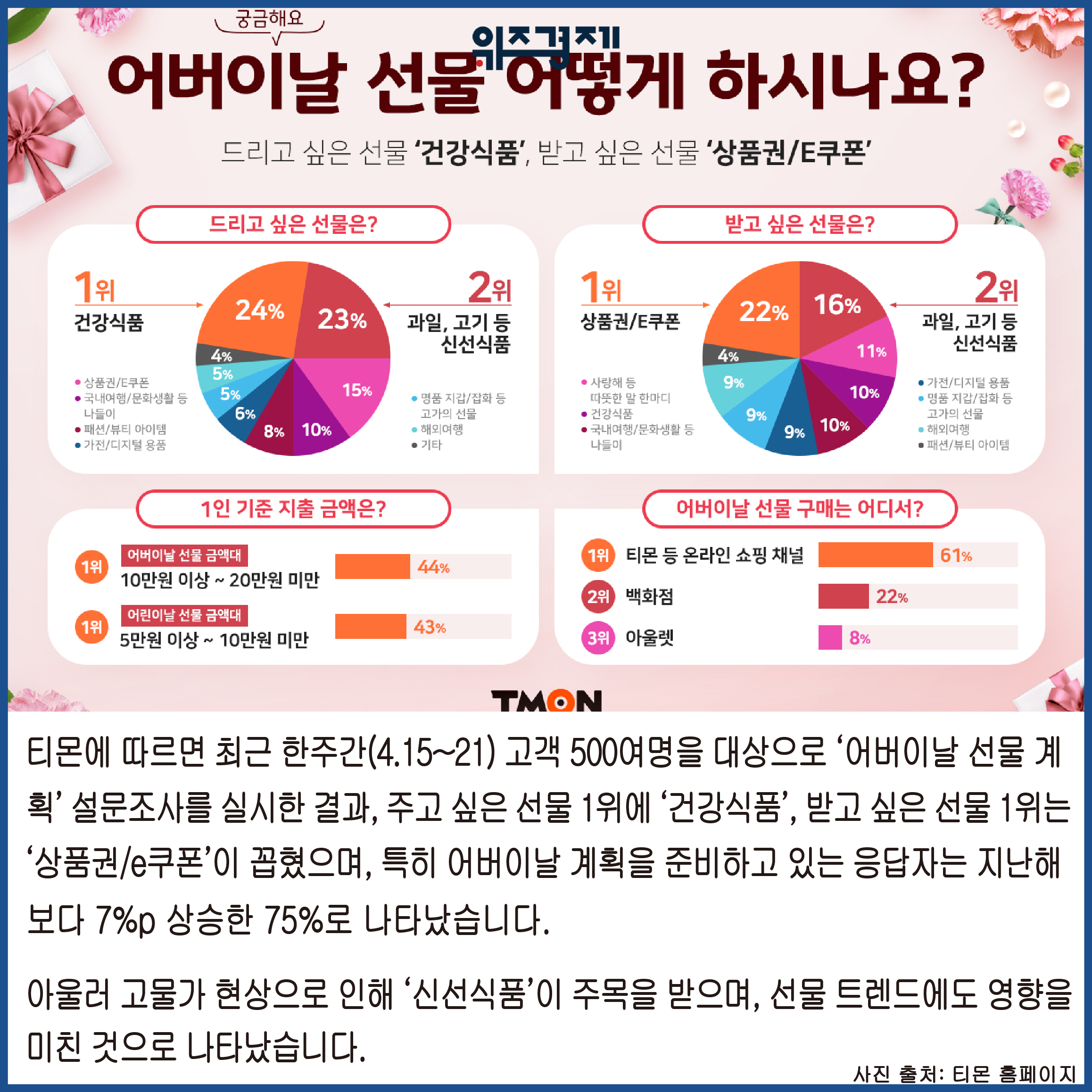 티몬에 따르면 최근 한주간(4.15~21) 고객 500여명을 대상으로 ‘어버이날 선물 계획’ 설문조사를 실시한 결과, 주고 싶은 선물 1위에 ‘건강식품, 받고