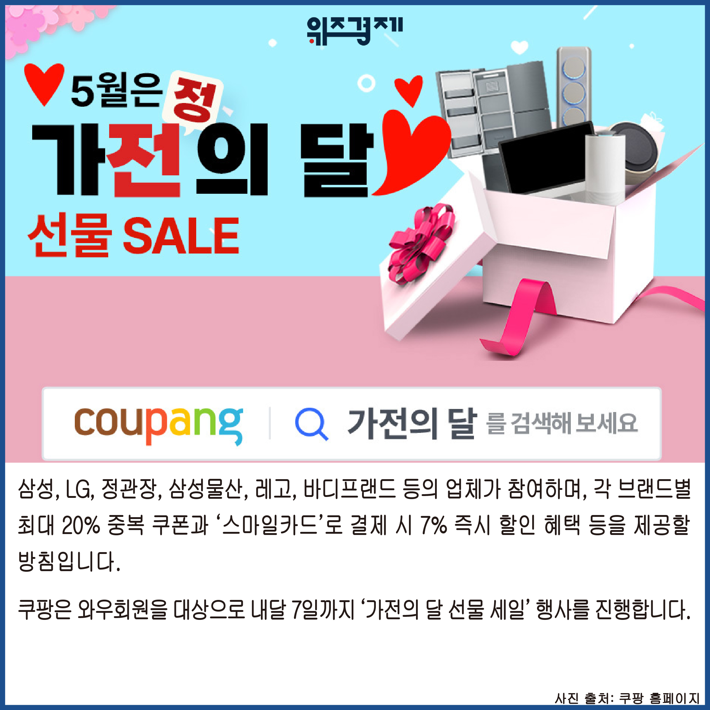 쿠팡은 와우회원을 대상으로 내달 7일까지 ‘가전의 달 선물 세일’ 행사를 진행합니다.
