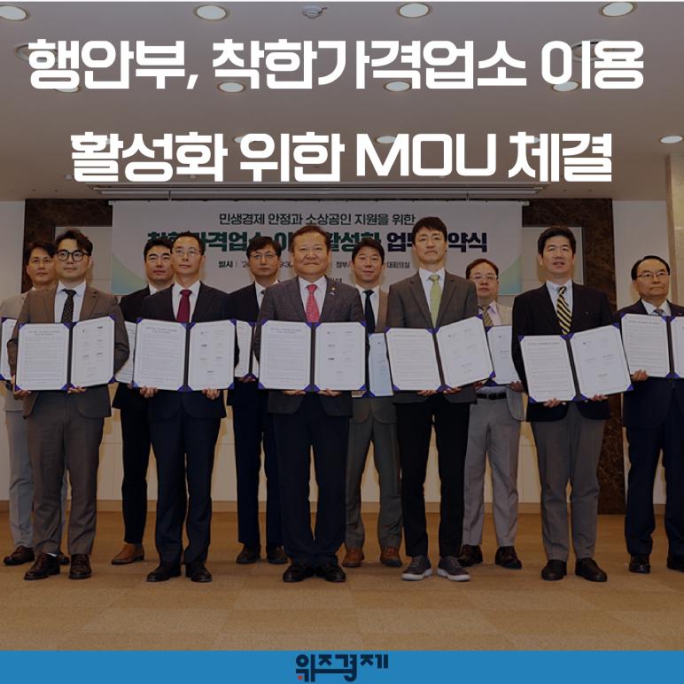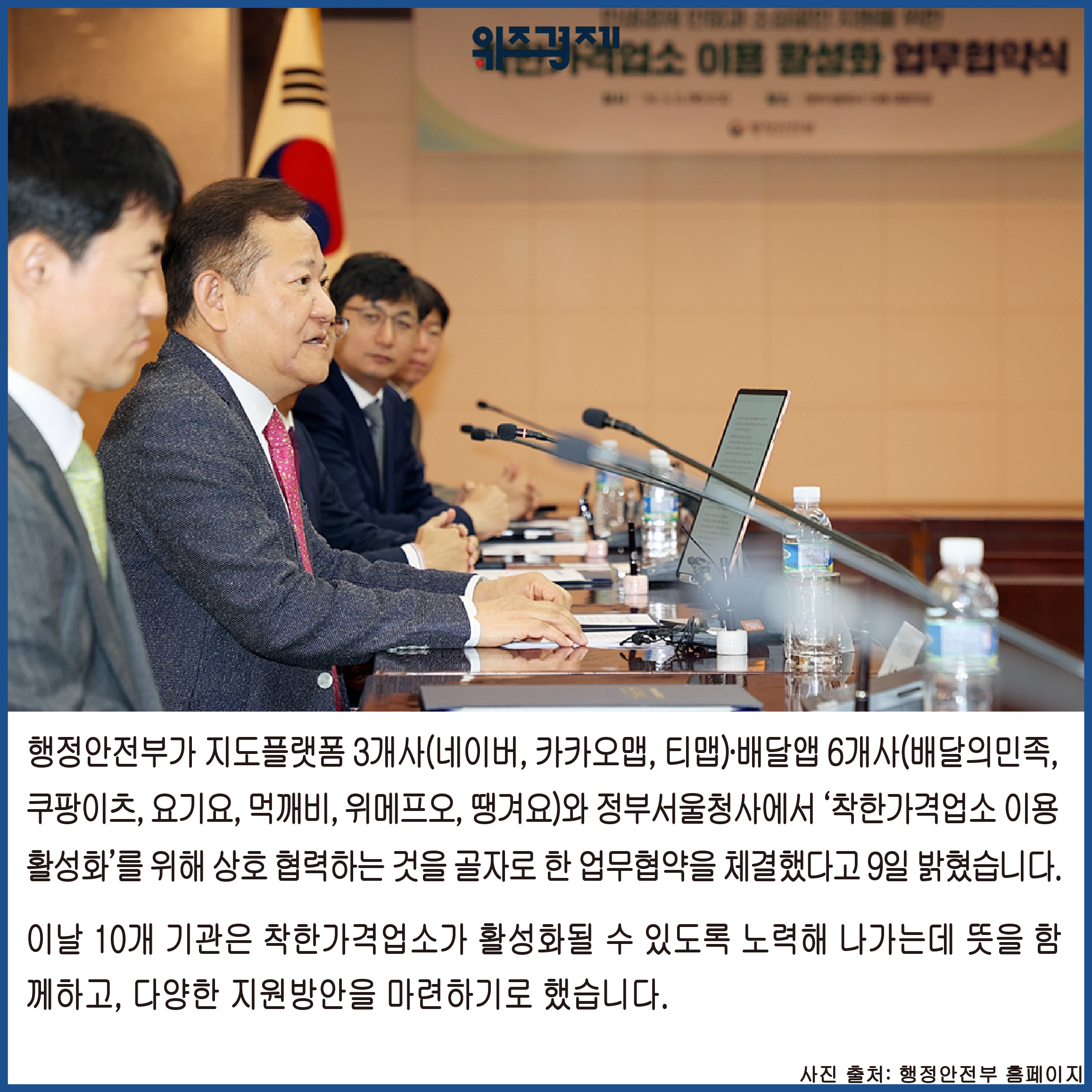 [위즈경제] 이정원 기자 =행정안전부가 지도플랫폼 3개사(네이버, 카카오맵, 티맵)∙배달앱 6개사(배달의민족, 쿠팡이츠, 요기요, 먹깨비, 위메프오, 땡겨요)와 정부서울청사에서 ‘착한가격업소 이용 활성화’를 위해 상호 협력하는 것을 골조로 한 업무협약을 체결했다고 9일 밝혔습니다.