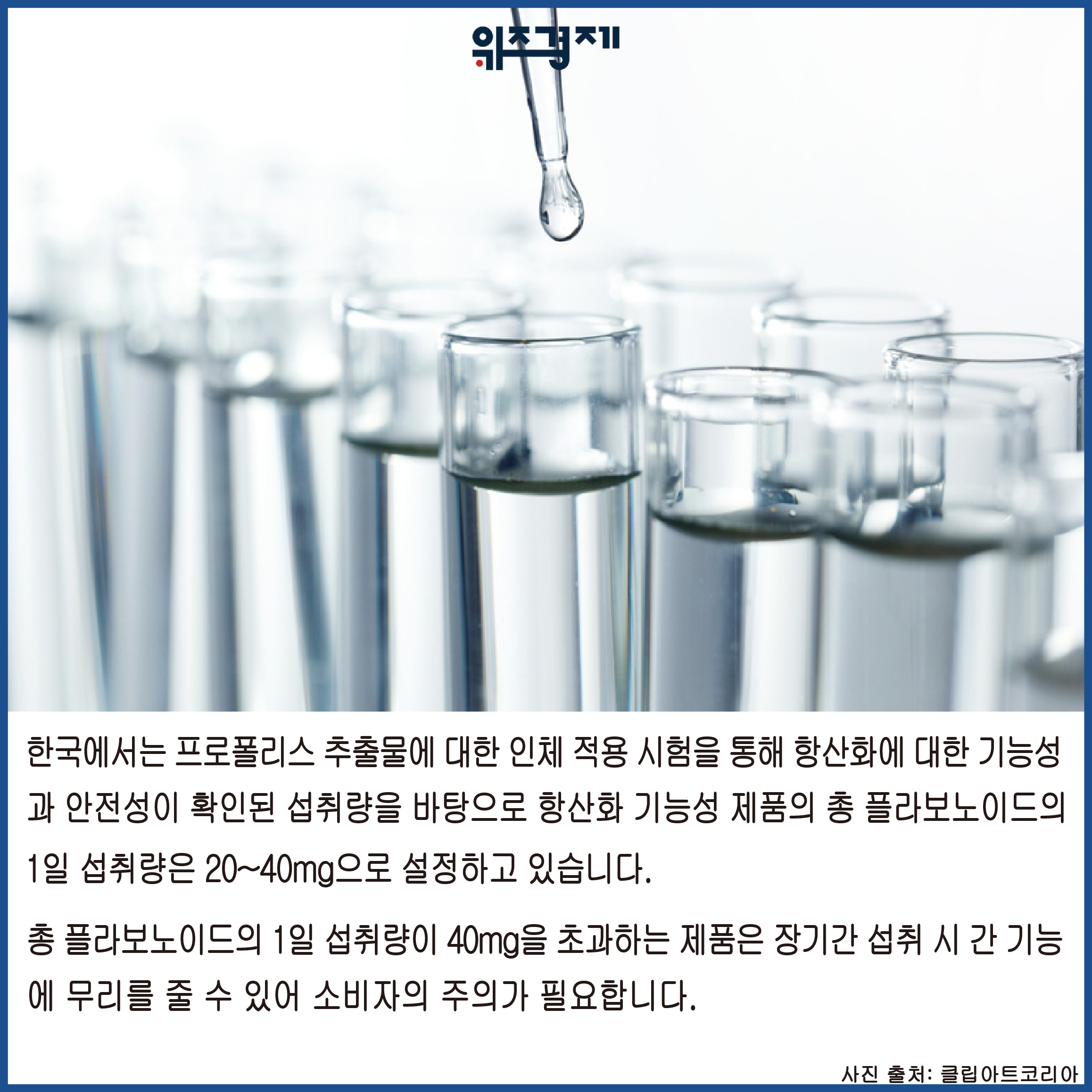 한국에서는 프로폴리스 추출물에 대한 인체 적용 시험을 통해 항산화에 대한 기능성과 안전성이 확인된 섭취량을 바탕으로
