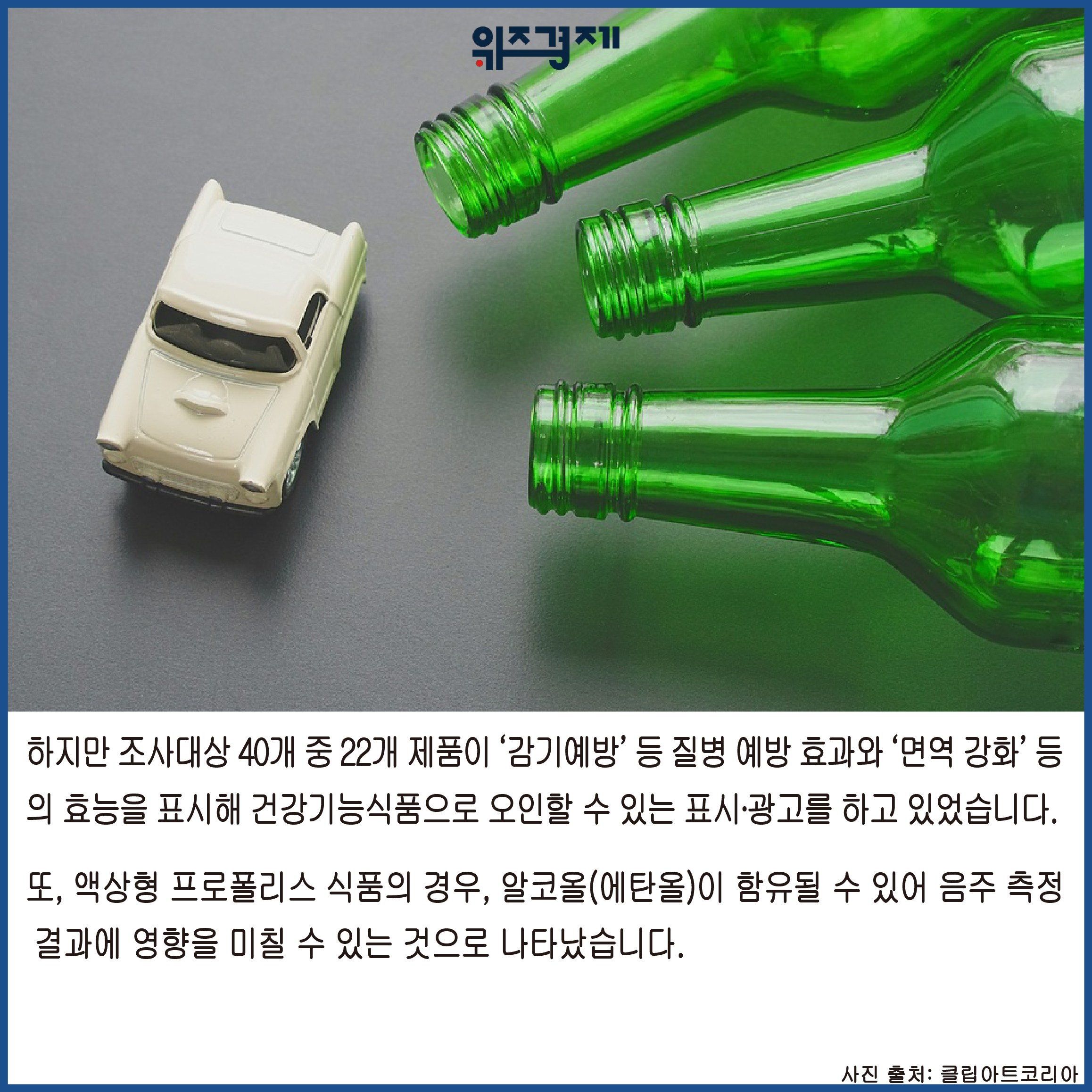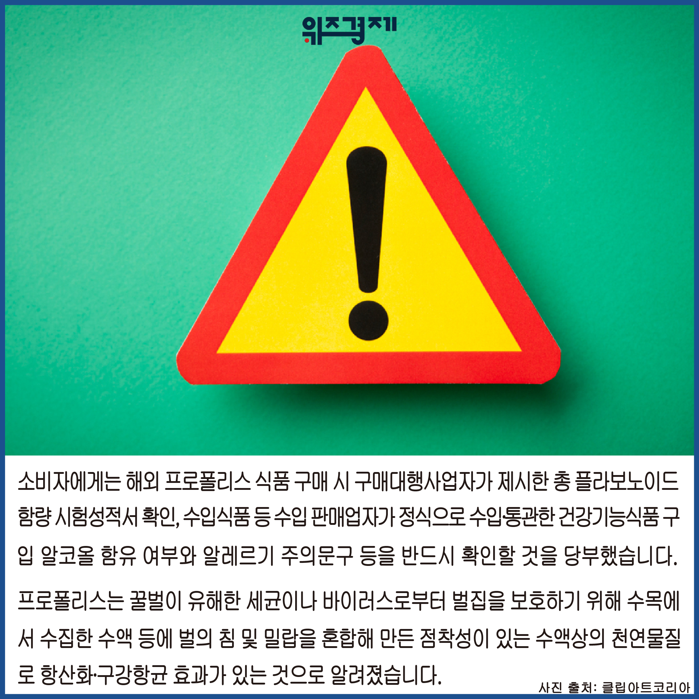 한국소비자원에 따르면 온라인 쇼핑물에서 구매대행으로 판매하는 해외 프로폴리스 식품 40개의 기능성 성분, 알코올 함량 등을 조사한 결과, 18개 제품에서 항산화 기능성 성분인 총 플라보노이드 함량이 국내 기능성 인정요건 보다 부족하거나 초과한 것으로