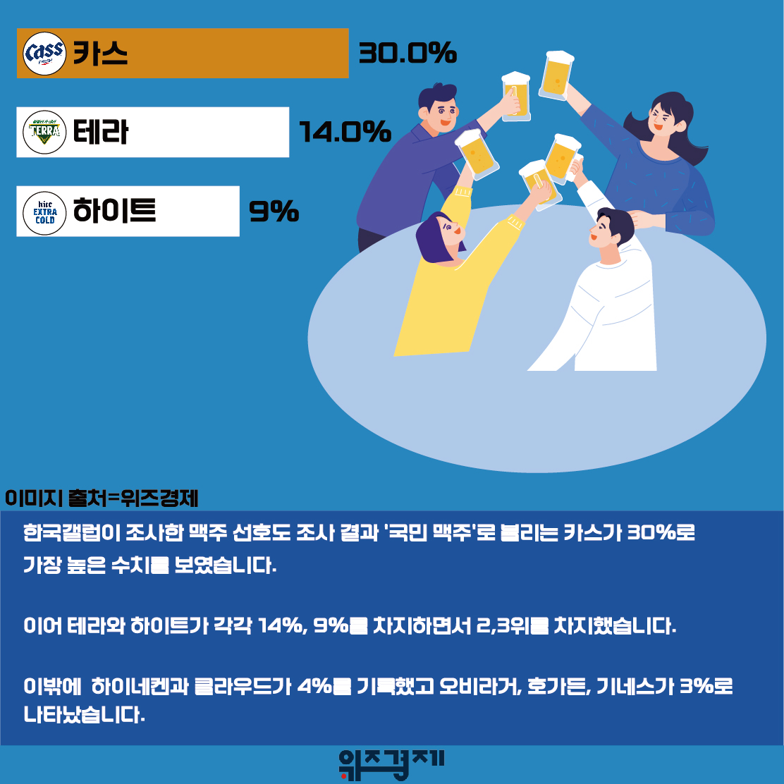 한국갤럽이 조사한 맥주 선호도 조사 결과 ‘국민 맥주’로 불리는 카스가 30%로 가장 높은 수치를 보였습니다.