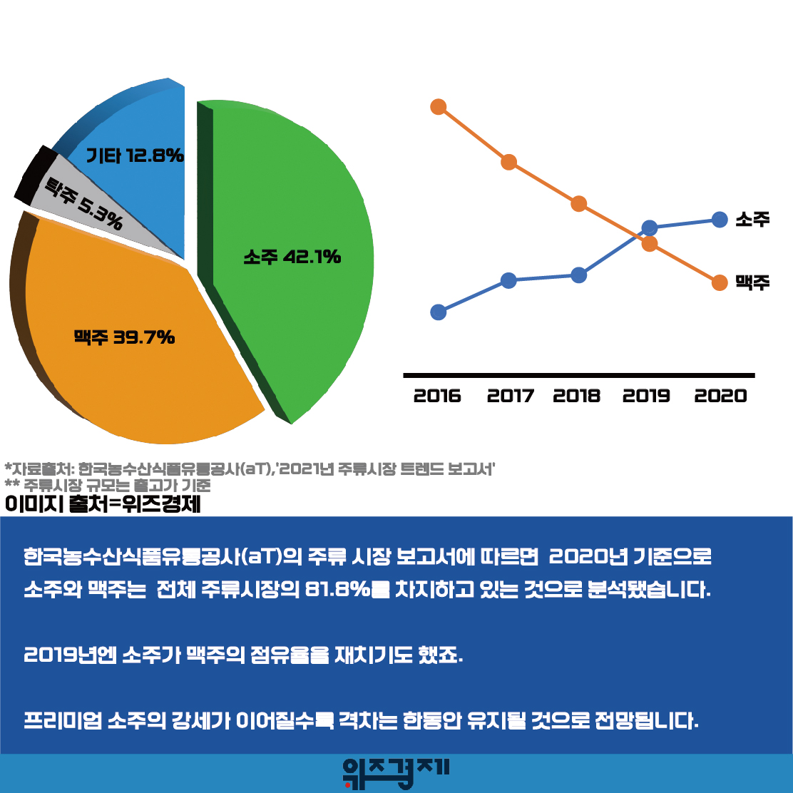 한국농수산식품유통공사(aT)의 주류 시장 보고서에 따르면 2020년 기준으로 소주와 맥주는 전체