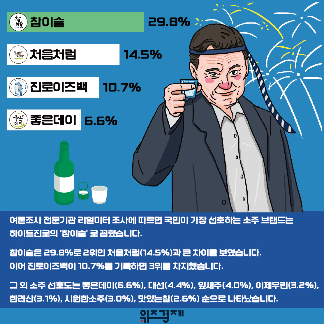 처음처럼(14.5%)과 큰 차이를 보였습니다. 이어 진로이즈백이 10.7%를 기록하면 3위를 차지했습니다.