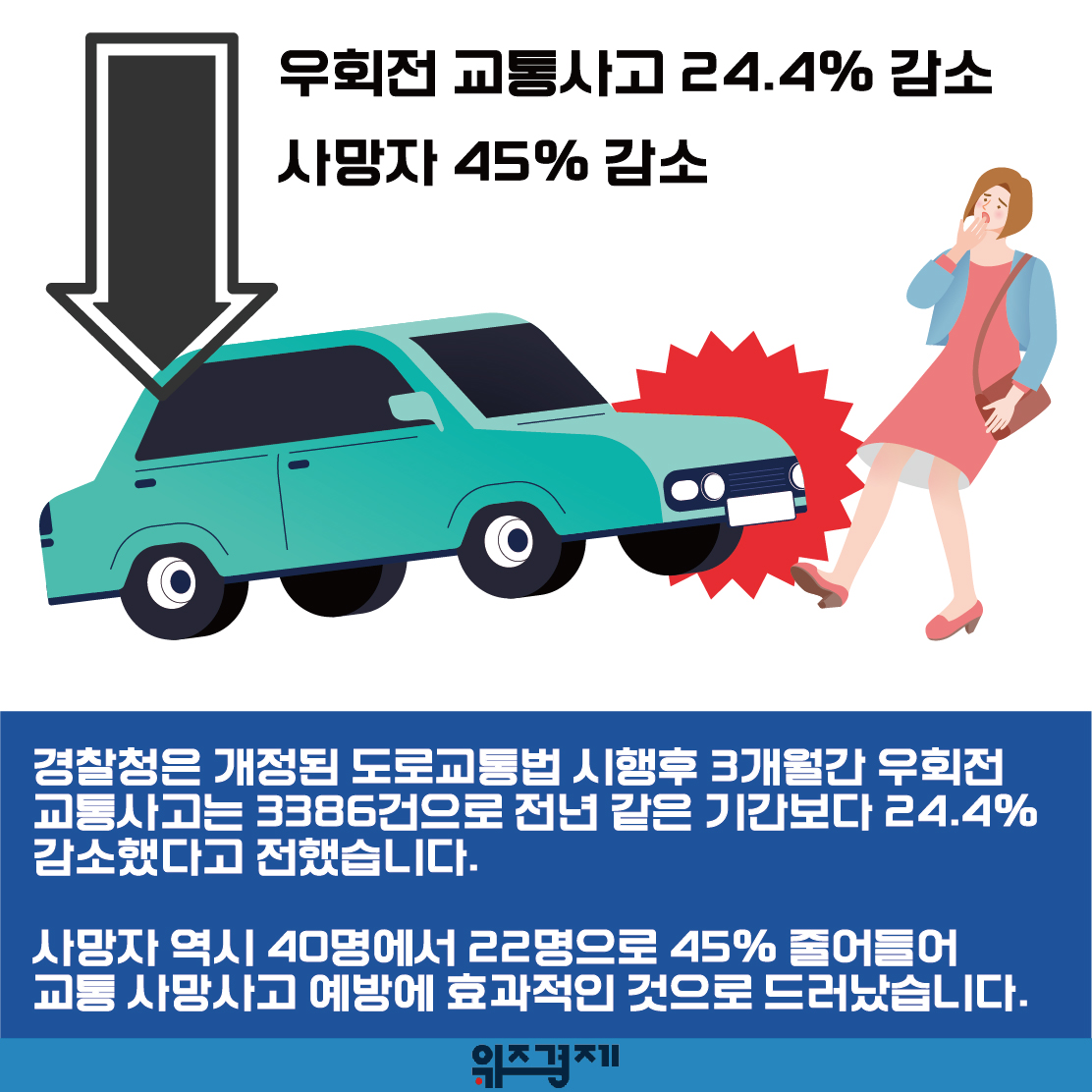 경찰청은 개정된 도로교통법 시행후 3개월간 우회전교통사고는 3386건으로 전년 같은 기간보다 24.4% 감소했다고 전했습니다.