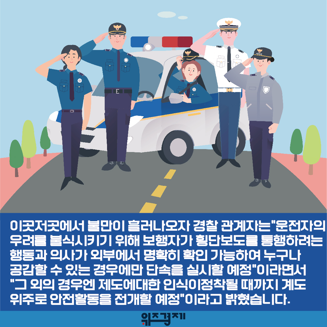 위해 보행자가 횡단보도를 통행하려는 행동과 의사가 외부에서 명확히 확인 가능하여 누구나 공감할 수 있는 경우에만 단속을 실시할 예정”이라면서 “그 외의 경우엔 제도에대한 인식이정착될 때까지 계도 위주로 안전활동을 전개할 예정”이라고 밝혔습니다.