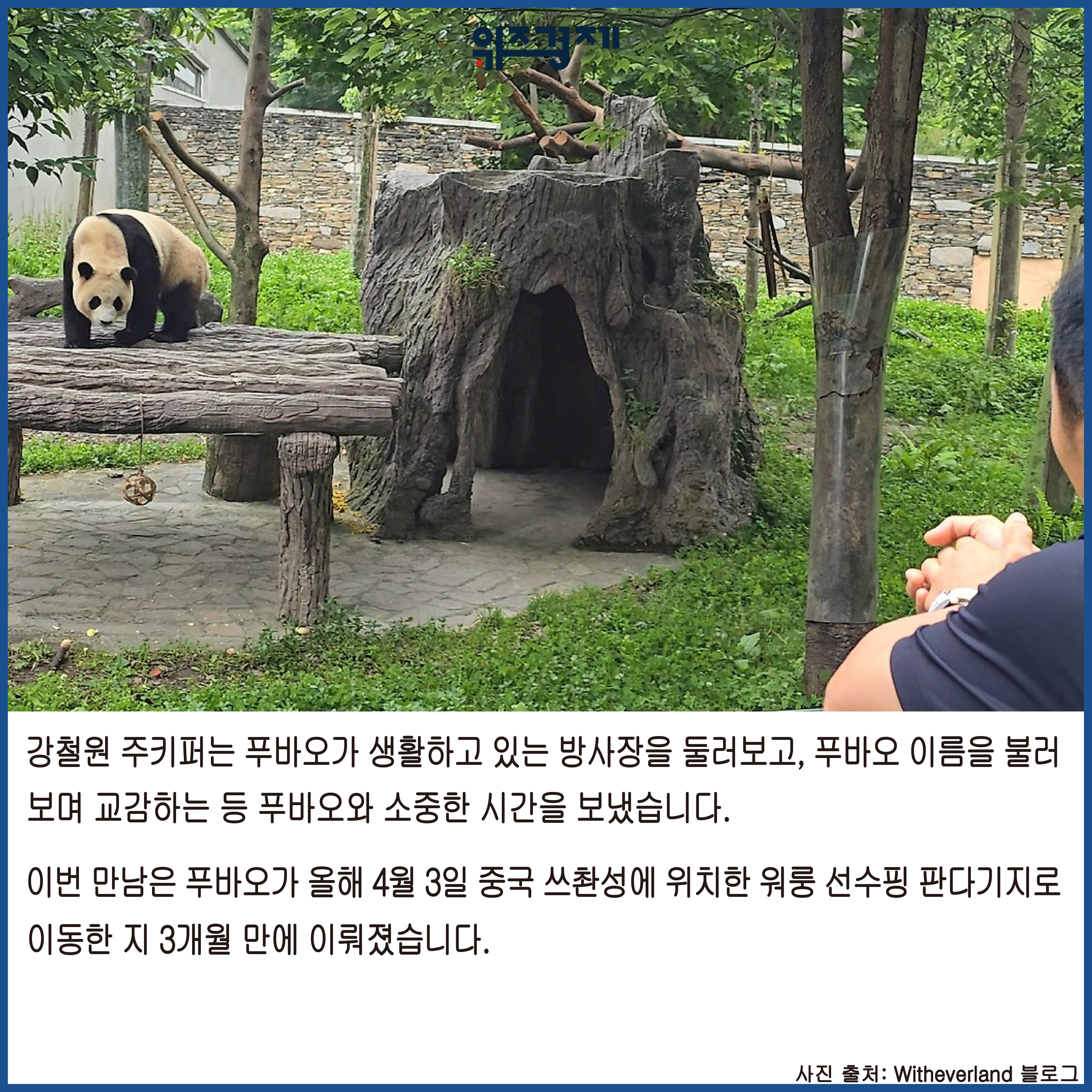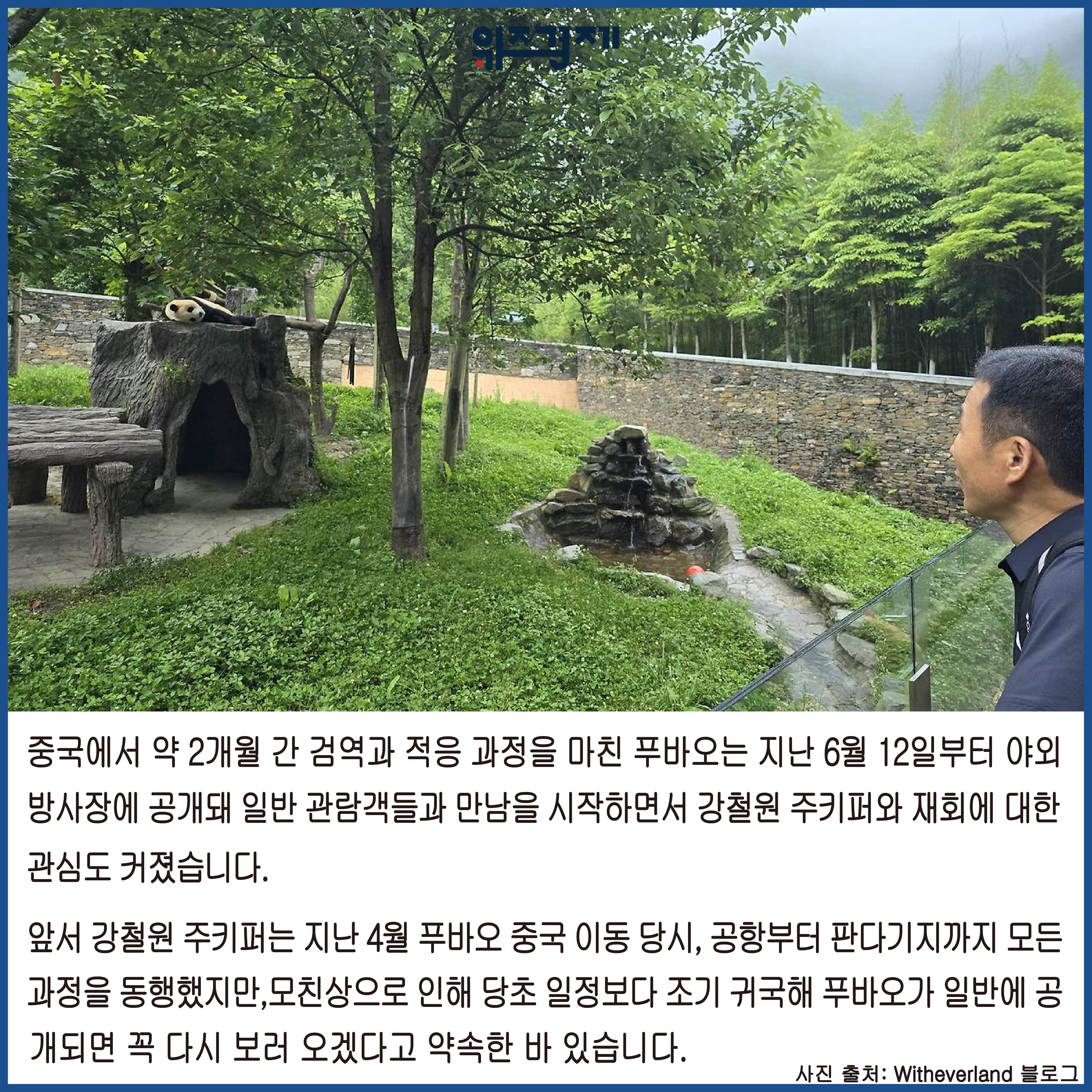 중국에서 약 2개월 간 검역과 적응 과정을 마친 푸바오는 지난 6월 12일부터 야외 방사장에 공개돼 일반 관람객들과 만남을 시작하면서 강철원 주키퍼와 재회에 대한 관심도 커졌습니다.