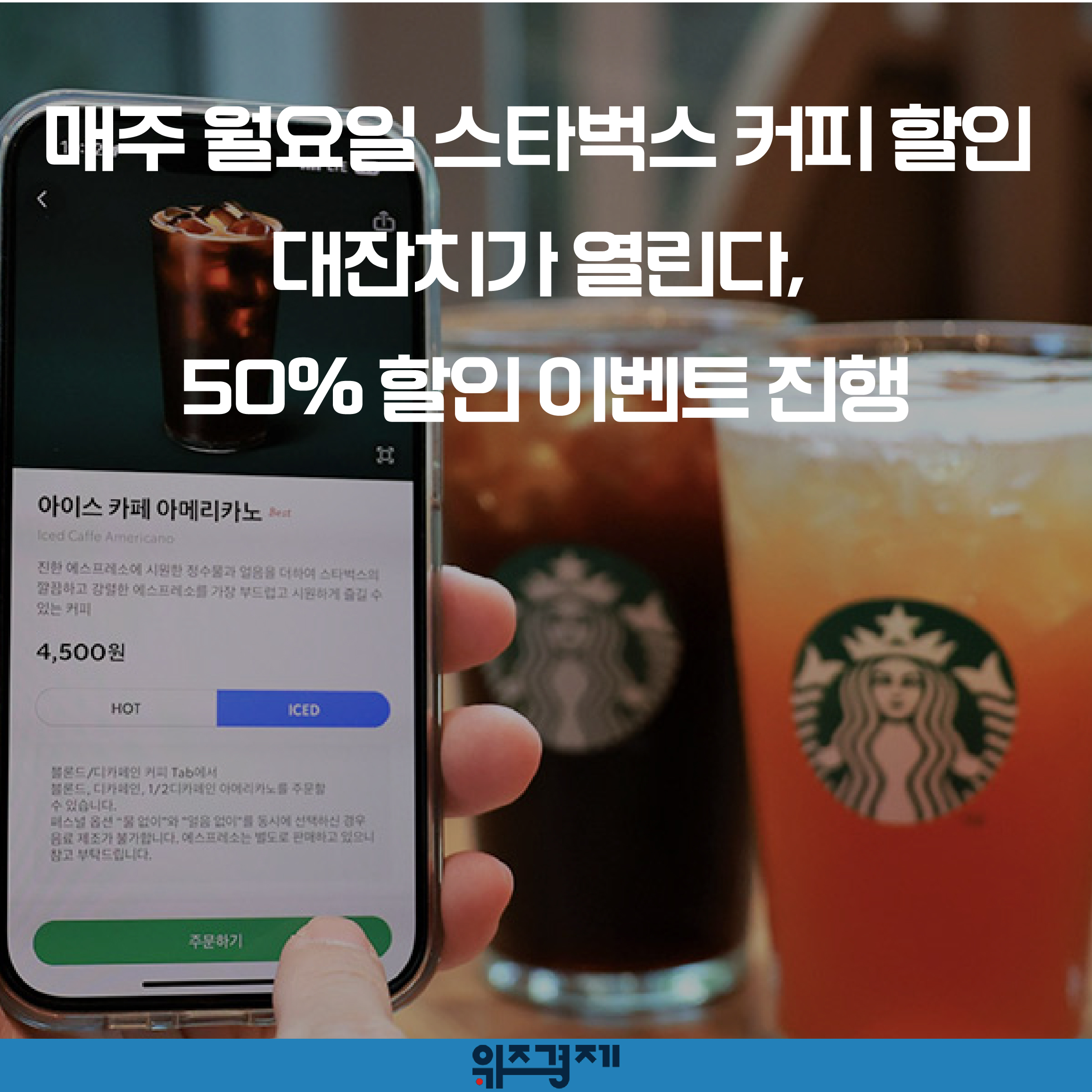 [위즈경제] 이정원 기자 =스타벅스코리아가 모바일 주문 및 결제 서비스인 사이렌 오더의 누적 주문 건수 5억 건 돌파를 기념해 8월 12일부터 매주 월요일 오후 2시부터 5시까지 사이렌 오더로 주문 시 50% 할인 혜택을 제공하는 ‘앱피 먼데이(App-Y MONDAY)’ 이벤트를 실시합니다.