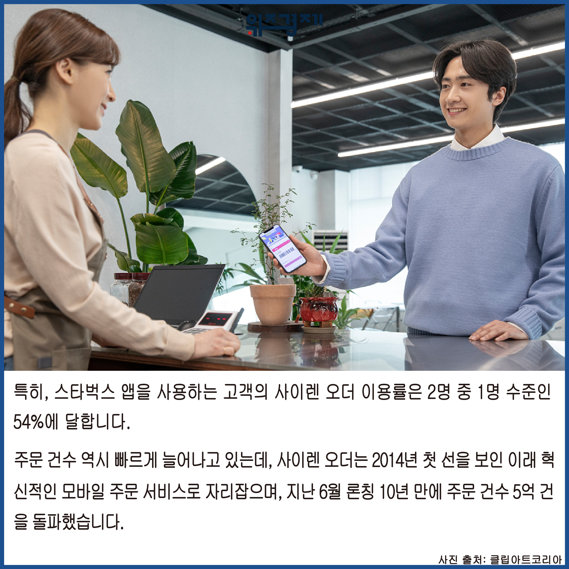 특히, 스타벅스 앱을 사용하는 고객의 사이렌 오더 이용률은 2명 중 1명 수준인 54%에