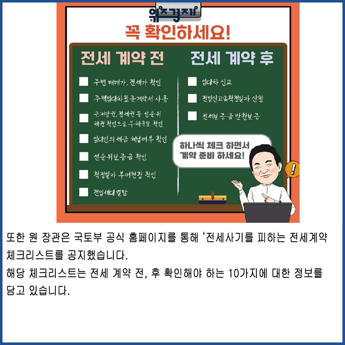 또한 원 장관은 국토부 공식 홈페이지를 통해 ‘전세사기를 피하는 전세계약