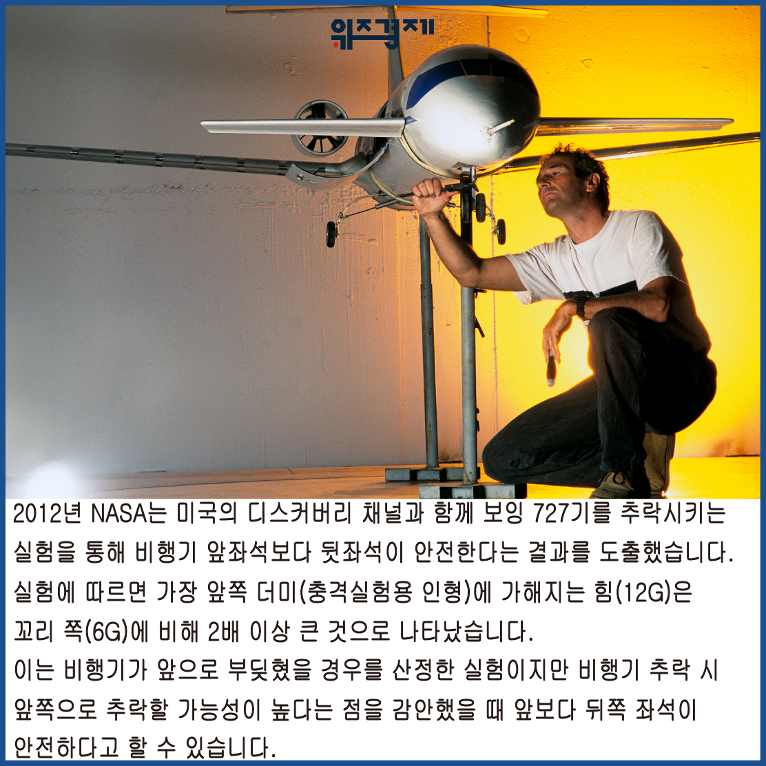 디스커버리 채널과 함께 보잉 727기를 추락시키는 실험을 통해 비행기 앞좌석보다 뒷좌석이 안전한다는