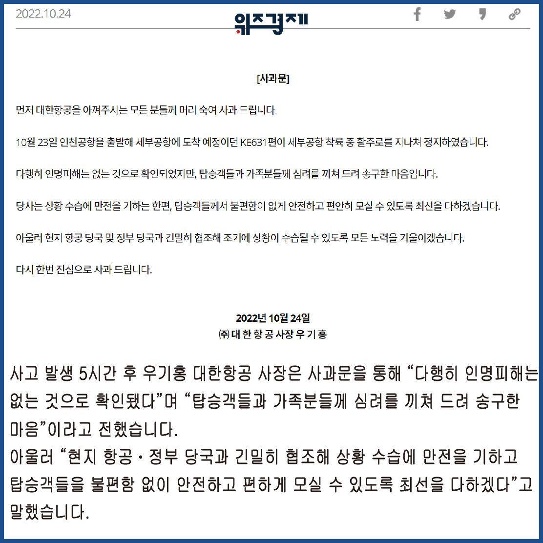 사고 발생 5시간 후 우기홍 대한항공 사장은 사과문을 통해 “다행히 인명피해는 없는 것으로 확인됐다”며 “탑승객들과 가족분들께 심려를 끼쳐 드려 송구한 마음”이라고 전했습니다. 아울러 “현지
