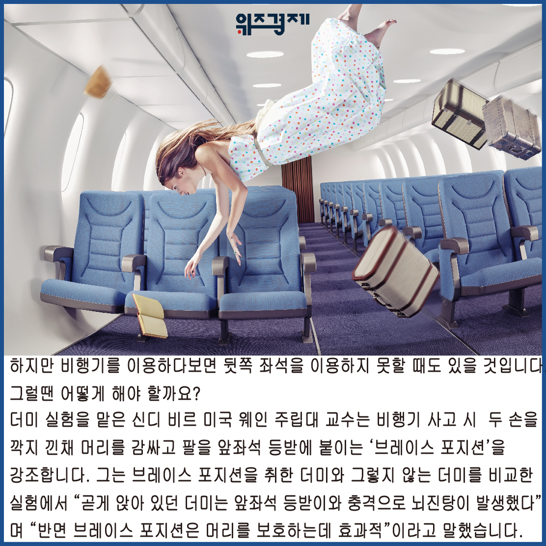더미 실험을 맡은 신디 비르 미국 웨인 주립대 교수는 비행기 사고 시 두 손을 깍지 낀채 머리를 감싸고 팔을 앞좌석 등받에 붙이는 ‘브레이스 포지션’을 강조합니다. 그는