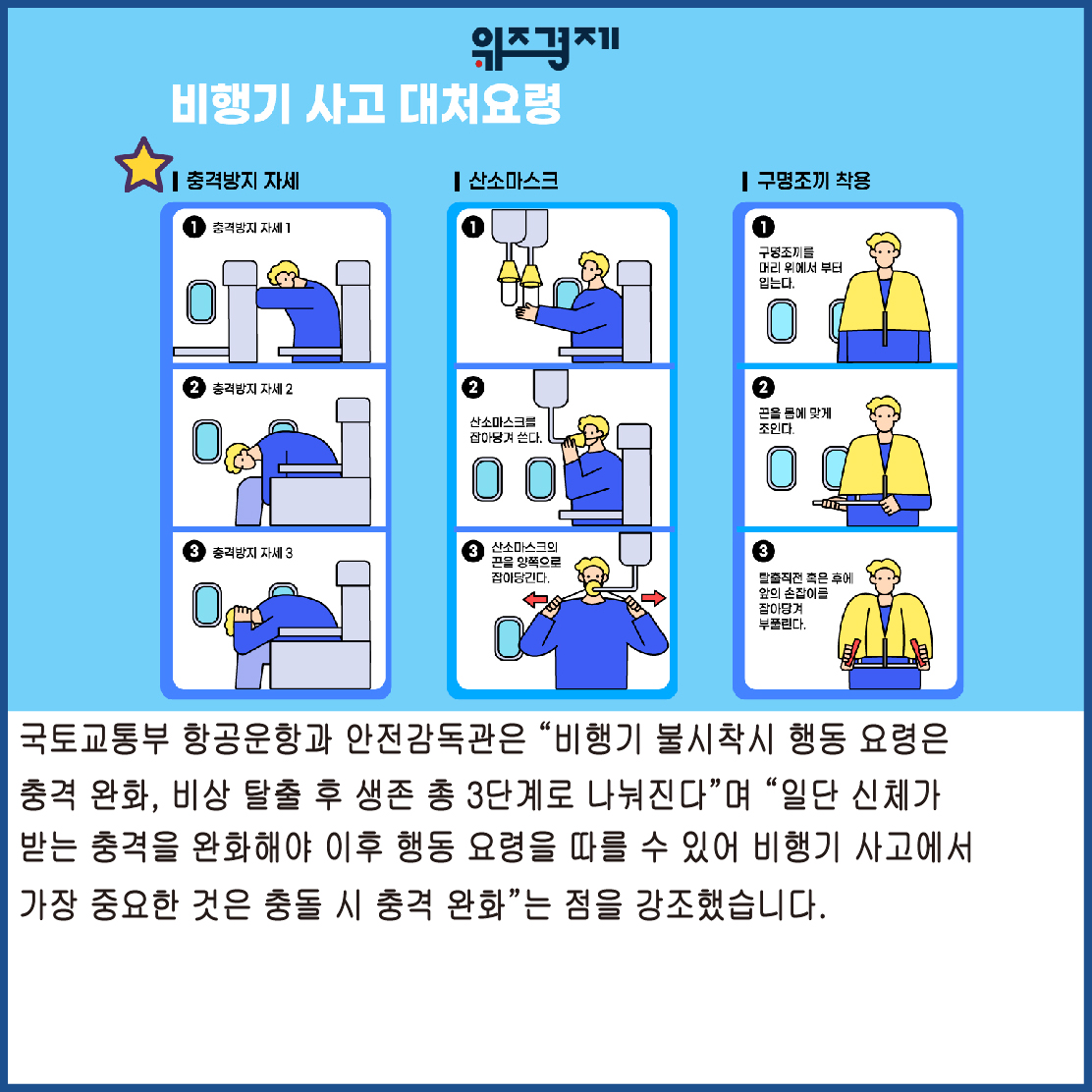 국토교통부 항공운항과 안전감독관은 "비행기 불시착시 행동 요령은 충격 완화, 비상 탈출 후 생존 총 3단계로 나눠진다”며 “일단 신체가 받는 충격을 완화해야 이후 행동 요령을 따를 수 있어 비행기 사고에서 가장 중요한 것은 충돌 시 충격 완화"라는 점을 강조했습니다.