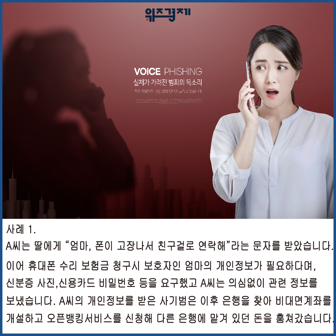 [위즈경제] 이정원 기자 = #A씨는 딸에게 “엄마, 폰이 고장나서 친구걸로 연락해”라는 문자를 받았습니다. 이어 휴대폰 수리 보험금 청구시 보호자인 엄마의 개인정보가 필요하다며,신분증 사진,신용카드 비밀번호 등을 요구했고 A씨는 의심없이 관련 정보를 보냈습니다. A씨의 개인정보를 받은 사기범은 이후 은행을 찾아 비대면계좌를 개설하고 오픈뱅킹서비스를 신청해 다른 은행에 맡겨 있던 돈을 훔쳐갔습니다.