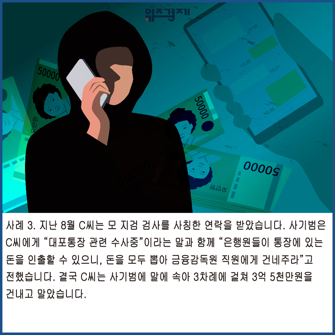 금융감독원 직원에게 건네주라”고 전했습니다. 결국 C씨는 사기범에 말에 속아 3차례에 걸쳐 3억 5천만원을 건내고 말았습니다.