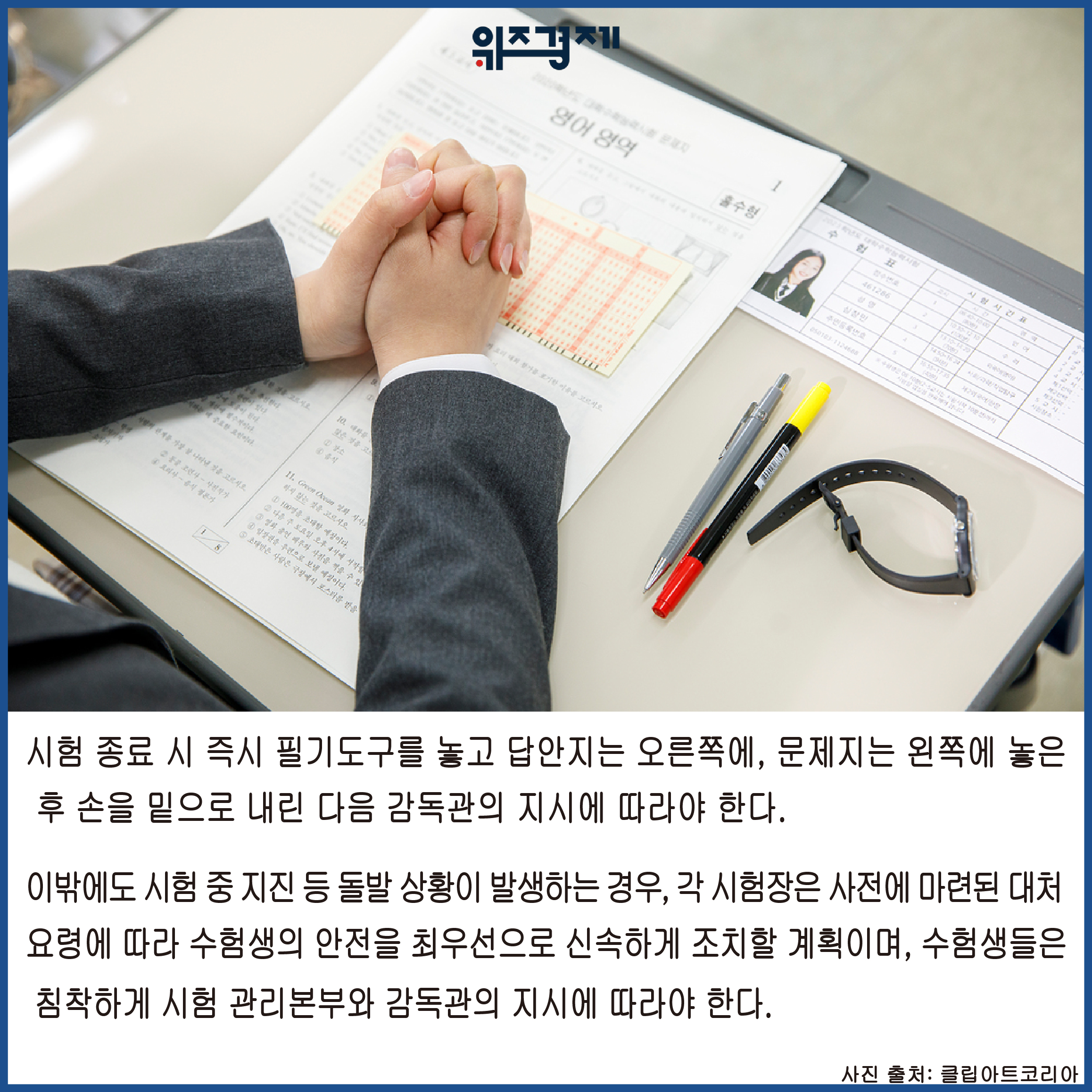 시험 종료 시 즉시 필기도구를 놓고 답안지는 오른쪽에, 문제지는 왼쪽에
