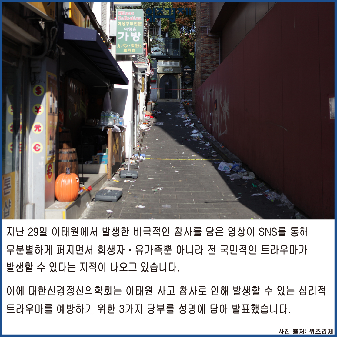 이에 대한신경정신의학회는 이태원 사고 참사로 인해 발생할 수 있는 심리적 트라우마를 예방하기 위한 3가지 당부를 성명에 담아 발표했습니다.