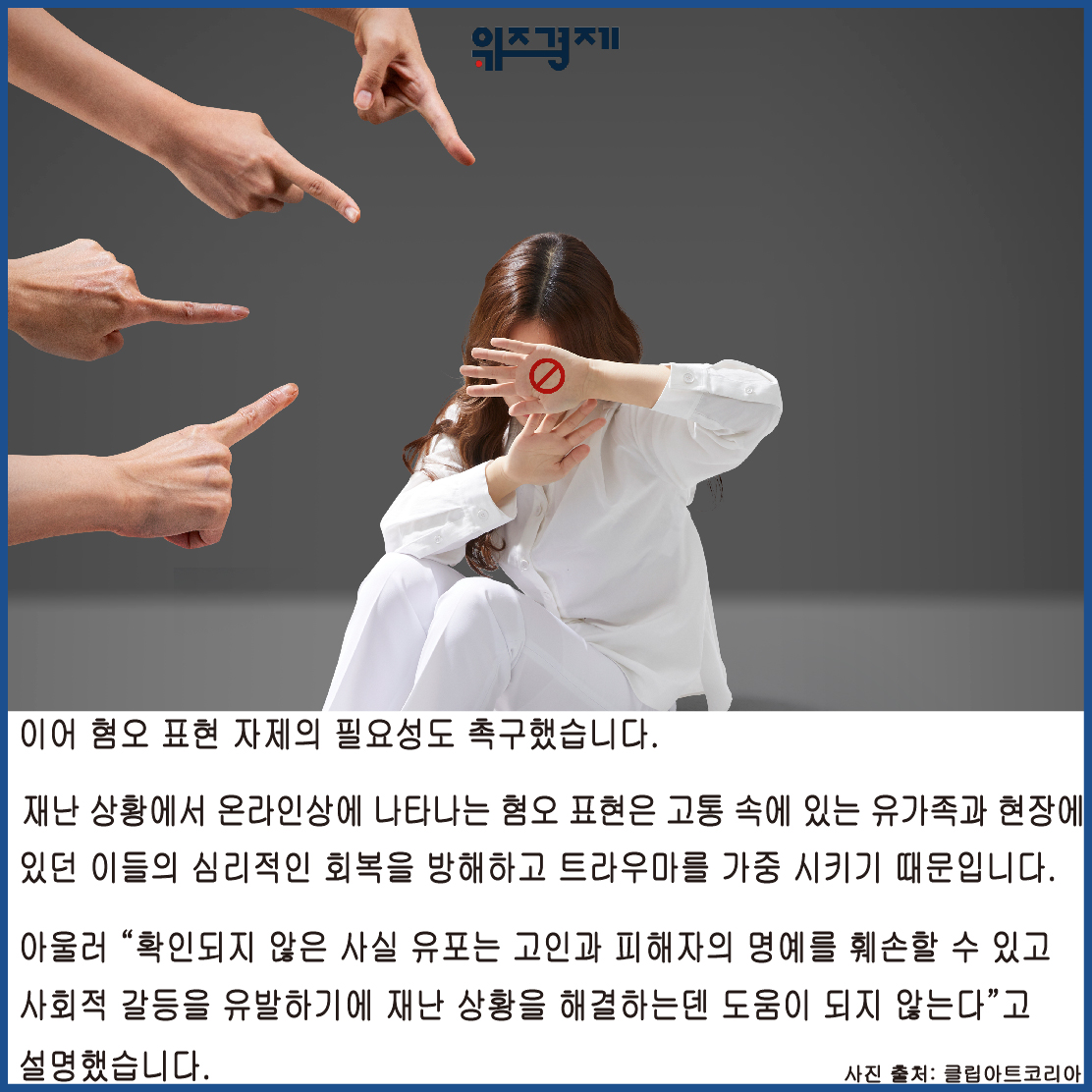 재난 상황에서 온라인상에 나타나는 혐오 표현은 고통 속에 있는 유가족과 현장에 있던 이들의 심리적인 회복을 방해하고
