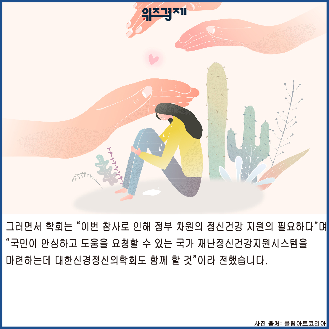 그러면서 학회는 “이번 참사로 인해 정부 차원의 정신건강 지원의 필요하다”며 “국민이 안심하고 도움을 요청할 수 있는 국가 재난정신건강지원시스템을 마련하는데 대한신경정신의학회도 함께