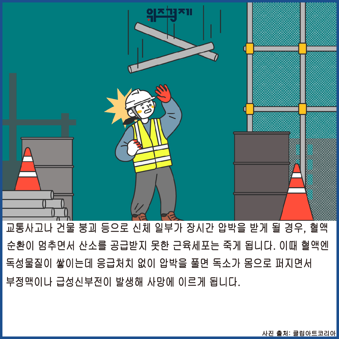 교통사고나 건물 붕괴 등으로 신체 일부가 장시간 압박을 받게 될 경우, 혈액순환이 멈추면서 산소를 공급받지 못한 근육세포는 죽게 됩니다. 이때 혈액엔 독성물질이 쌓이는데 응급처치 없이 압박을 풀면 독소가 몸으로 퍼지면서 부정맥이나 급성신부전이 발생해 사망에 이르게 됩니다.