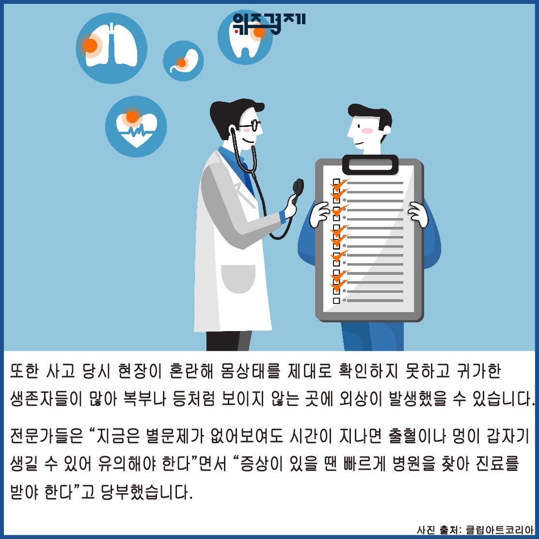 또한 사고 당시 현장이 혼란해 몸상태를 제대로 확인하지 못하고 귀가한 생존자들이 많아 복부나 등처럼 보이지 않는 곳에 외상이 발생했을 수 있습니다.