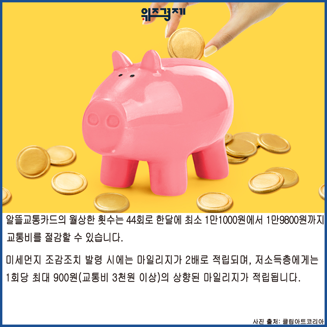 알뜰교통카드의 월상한 횟수는 44회로 한달에 최소 1만1000원에서 1만9800원까지 교통비를 절감할 수 있습니다. 미세먼지 조감조치 발령
