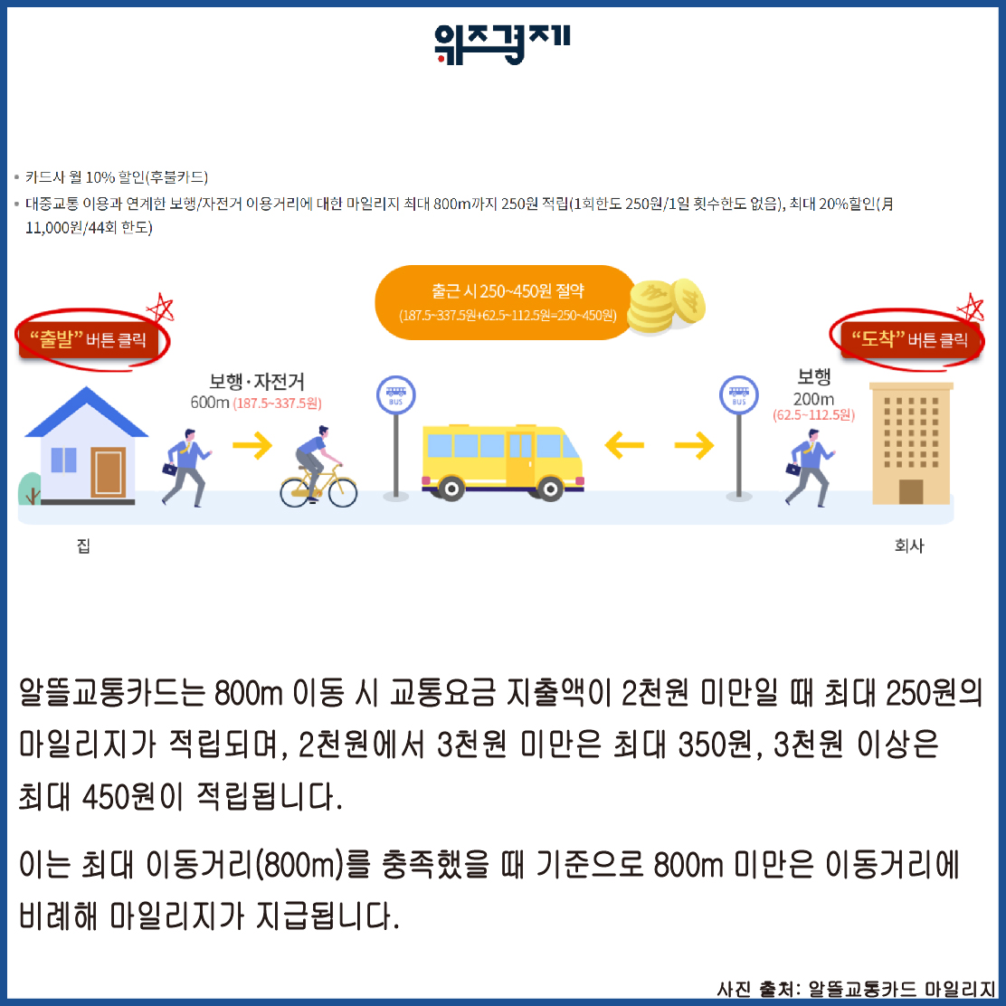 이 카드는 대중교통을 이용하기 위해 걷거나 자전거로 이동한 거리만큼 마일리지를 적립해 대중교통비를 최대 30%까지 절감할 수 있습니다. 또한 카드사별로 커피 프렌차이즈, 대형 마트 등에서 사용할 수 있는 다양한 할인 혜택까지 제공해 소비자들의 소비 부담을 줄여주고 있습니다.