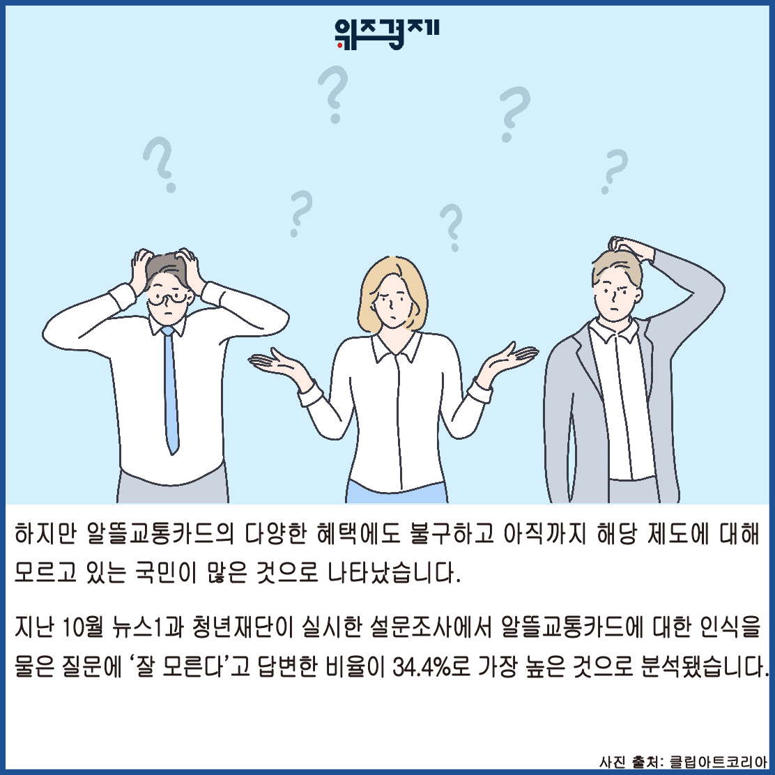 하지만 알뜰교통카드의 다양한 혜택에도 불구하고 아직까지 해당 제도에 대해 모르고 있는 국민이 많은 것으로 나타났습니다.