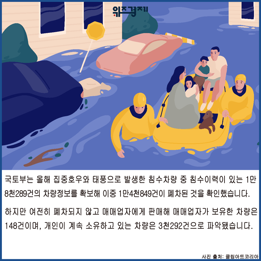 [위즈경제] 이정원 기자 = 국토부는 올해 집중호우와 태풍으로 발생한 침수차량 중 침수이력이 있는 1만8천289건의 차량정보를 확보해 이중 1만4천849건이 폐차된 것을 확인했습니다.