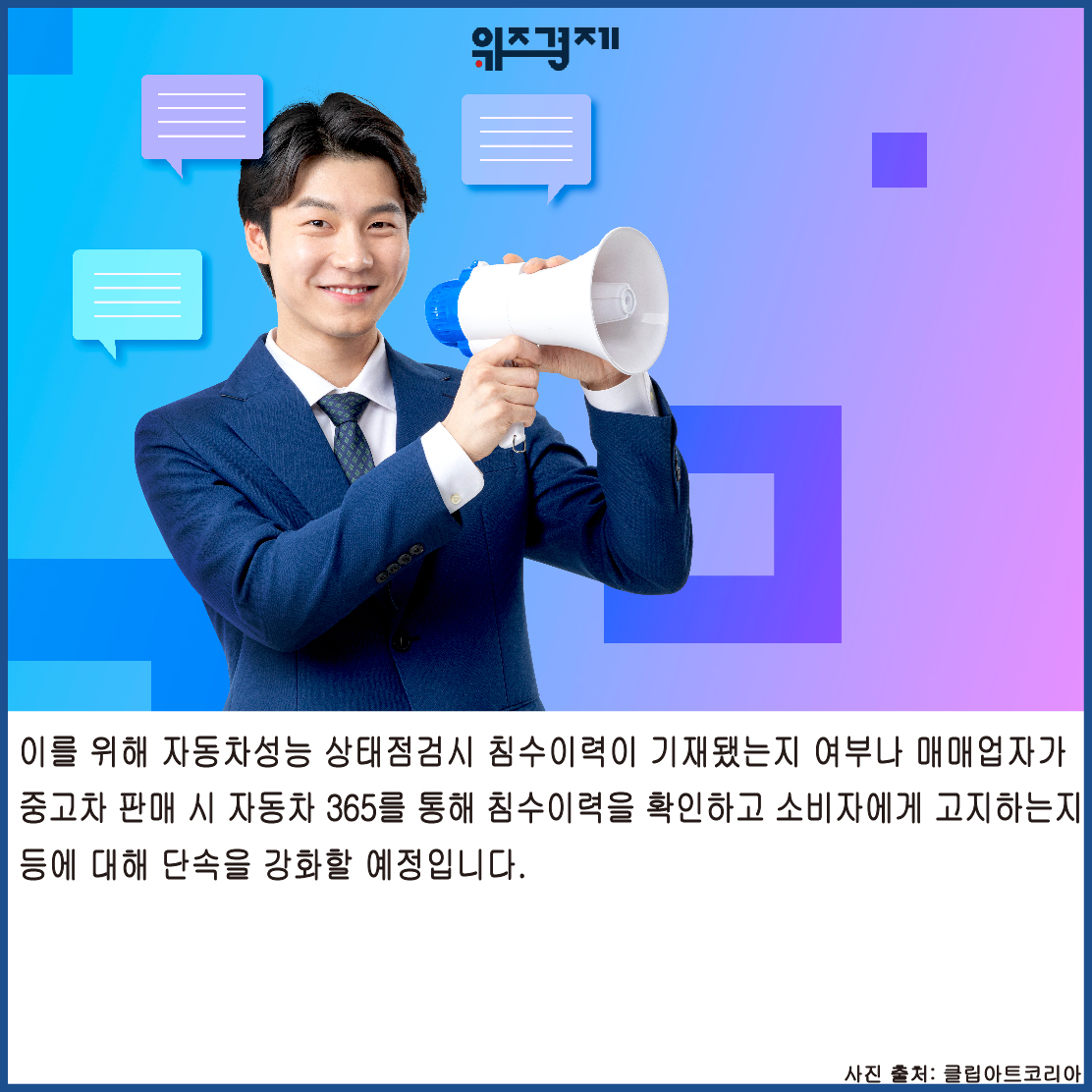 이를 위해 자동차성능 상태점검시 침수이력이 기재됐는지 여부나 매매업자가 중고차 판매 시 자동차 365를 통해 침수이력을 확인하고 소비자에게 고지하는 등에 대해 단속을 강화할 예정입니다.