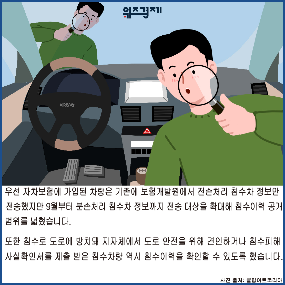 자차보험에 가입된 차량은 기존에 보험개발원에서 전손처리 침수차 정보만 전송했지만 9월부터 분손처리 침수차 정보까지 전송 대상을 확대해 침수이력 공개 범위를 넓혔습니다.
