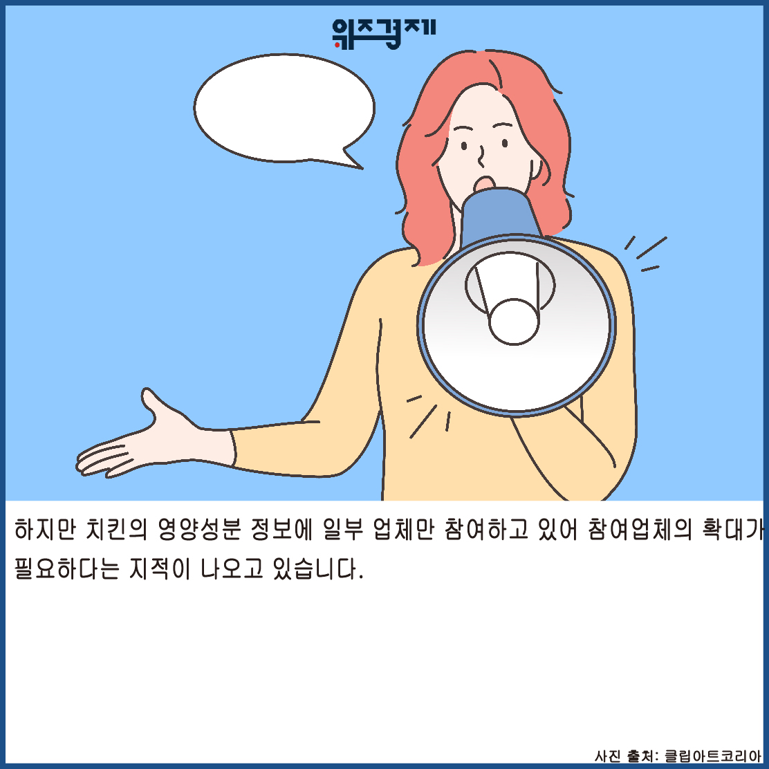 하지만 치킨의 영양성분 정보에 일부 업체만 참여하고 있어 참여업체의 확대가 필요하다는 지적이 나오고 있습니다.